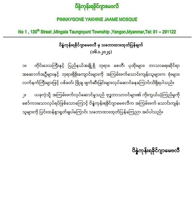 ၂။ ယခုကဲ့သို့ အကြမ်းဖက်လုပ်ဆောင်မှုသည် ဗုဒ္ဓဘာသာဝင်များ၏ ကိုးကွယ်ယုံကြည်မှုကို စော်ကားသောလုပ်ရပ်ဖြစ်သောကြောင့် ပိန္နဲကုန်းရခိုင်ဂျာမေဗလီက အကြမ်းဖက် သောင်းကျန်း သူများကို ပြင်းထန်စွာရှုတ်ချပါကြောင်း သဘောထားထုတ်ပြန်ကြေညာ အပ်ပါသည်။