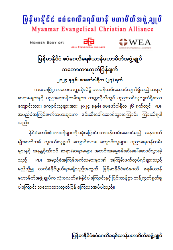 မြန်မာနိုင်ငံ ဧဝံဂေလိခရစ်ယာန်မဟာမိတ်အဖွဲ့ချုပ် သဘောထားထုတ်ပြန်ချက်