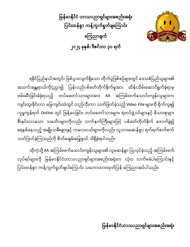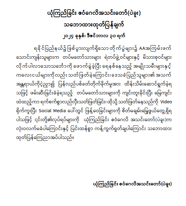 ရခိုင်ပြည်နယ်အတွင်း ဖြစ်ပွားလျက်ရှိသော တိုက်ပွဲဖြစ်စဉ်များ၌ ဒေသခံပြည်သူများ၏ အသက်အန္တရာယ်ကိုငဲ့ညှာ၍ ပြန်လည်ပစ်ခတ်တိုက်ခိုက်မှုအား ထိန်းသိမ်းဆောင်ရွက်ခဲ့ရသဖြင့် ဖမ်းဆီးခြင်းခံခဲ့ရသည့် တပ်မတော်သားများအား AA အကြမ်းဖက်သောင်းကျန်းသူများက ကျင်းတူးခိုင်းပြီး မြေကျင်းထဲသို့ထည့်၍ လည်လှီးကာသတ်ဖြတ်ခြင်း၊ အဆိုပါလည်လှီးသတ်ဖြတ်နေသည့် Video File များကို ရိုက်ကူး၍ Online ပေါ်တွင် ဖြန့်ဝေခြင်း ပြုလုပ်လျက်ရှိသည်။ ထို့ပြင် ကျောက်တော်နယ်မြေ၌လည်း တပ်မတော်သားများ ရဲတပ်ဖွဲ့ဝင်များနှင့် မိသားစုများလိုက်ပါလာသော သင်္ဘောကိုလည်း ပစ်ခတ်ဖောက်ခွဲ၍ ရေနစ်နေသည့် အမျိုးသမီးများနှင့် ကလေးငယ်များကိုလည်း ရက်ရက်စက်စက် သတ်ဖြတ်ခဲ့ကြသည်။