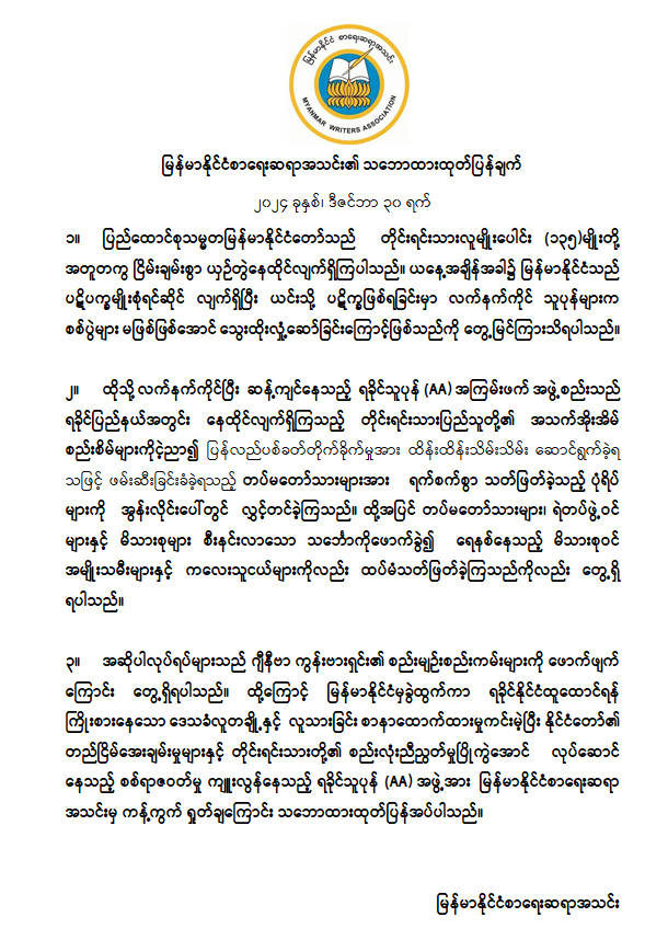 ယခုကဲ့သို့ AA အကြမ်းဖက်သောင်းကျန်းသူအဖွဲ့၏ စစ်ရာဇဝတ်မှု(War Crime) မြောက်သည့် လူမဆန်စွာရက်စက် ယုတ်မာရိုင်းစိုင်းသော အကြမ်းဖက်လုပ်ရပ်များအပေါ် မည်သို့မျှ လက်ခံနိုင်ဖွယ်ရာမရှိသည့်အတွက် ဗုဒ္ဓဘာသာကလျာဏယုဝအသင်း YMBA(ဗဟို)၊ ဘာသာပေါင်းစုံချစ်ကြည်ညီညွတ်ရေးအဖွဲ့(ဗဟို)၊ မြန်မာနိုင်ငံဧဝံဂေလိ ခရစ်ယာန်မဟာမိတ်အဖွဲ့ချုပ်၊ ပြည်ထောင်စုမြန်မာနိုင်ငံမက်သဒစ်အသင်းတော် (အောက်မြန်မာပြည်)၊ ယုံကြည်ခြင်းဧဝံဂေလိအသင်းတော်(ပဲခူး)၊ လွတ်မြောက်ခြင်းအသင်းတော်(ရန်ကုန်)၊ မြန်မာနိုင်ငံလုံးဆိုင်ရာဟိန္ဒူဘာသာရေးဗဟိုအဖွဲ့ချုပ်၊ မြန်မာနိုင်ငံလုံးဆိုင်ရာတမီလ်ဟိန္ဒူဖောင်ဒေးရှင်း(ဗဟို)၊ သနန္တဓမ္မပါလက(ဟိန္ဒူ)အဖွဲ့ချုပ်၊ မြန်မာနိုင်ငံလုံးဆိုင်ရာအစ္စလာမ်ဘာသာရေးအဖွဲ့ကြီး၊ မြန်မာနိုင်ငံသတင်းမီဒီယာကောင်စီ၊ မြန်မာနိုင်ငံစာရေးဆရာအသင်း၊ မြန်မာနိုင်ငံရုပ်ရှင်အစည်းအရုံး၊ မြန်မာနိုင်ငံဂီတအစည်းအရုံး(ဗဟို)၊ မြန်မာနိုင်ငံပန်းချီပန်းပုအစည်းအရုံး(ဗဟို)၊ မြန်မာနိုင်ငံသဘင်အစည်းအရုံး(ဗဟို)၊ မြန်မာနိုင်ငံဟာသပညာရှင်များအစည်းအရုံး၊ မြန်မာနိုင်ငံအားကစားမီဒီယာများအဖွဲ့ချုပ်နှင့် ပိန္နဲကုန်းရခိုင်ဂျာမေဗလီတို့မှ ပြင်းထန်စွာ ကန့်ကွက်ရှုတ်ချပါကြောင်း သဘောထားများ အသီးသီးထုတ်ပြန်ခဲ့ကြကြောင်း သတင်းရရှိသည်။