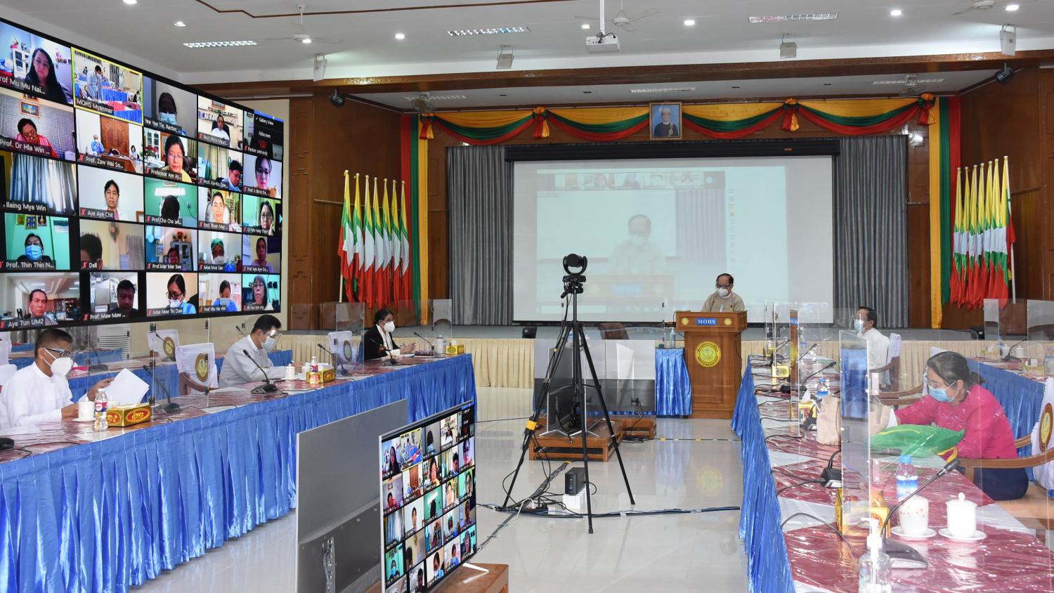 ဆေးတက္ကသိုလ်၊ နောက်ဆုံးနှစ် အပိုင်း (ခ) (ပုံမှန်) သင်တန်းနှင့် သွားဘက်ဆိုင်ရာ ဆေး တက္ကသိုလ် နောက်ဆုံးနှစ် (ပုံမှန်) သင်တန်းများ ပြန်လည်ဖွင့်လှစ်နိုင်ရေး စီမံချက် တင်ပြ ခြင်းနှင့် ဘွဲ့လွန်ဆေးပညာ သင်တန်းများဝင်ခွင့်ခေါ်ယူရေး ညှိနှိုင်းအစည်းအဝေးကို ယနေ့ မွန်းလွဲပိုင်းတွင် Video conferencing စနစ် ဖြင့် ကျင်းပသည်။