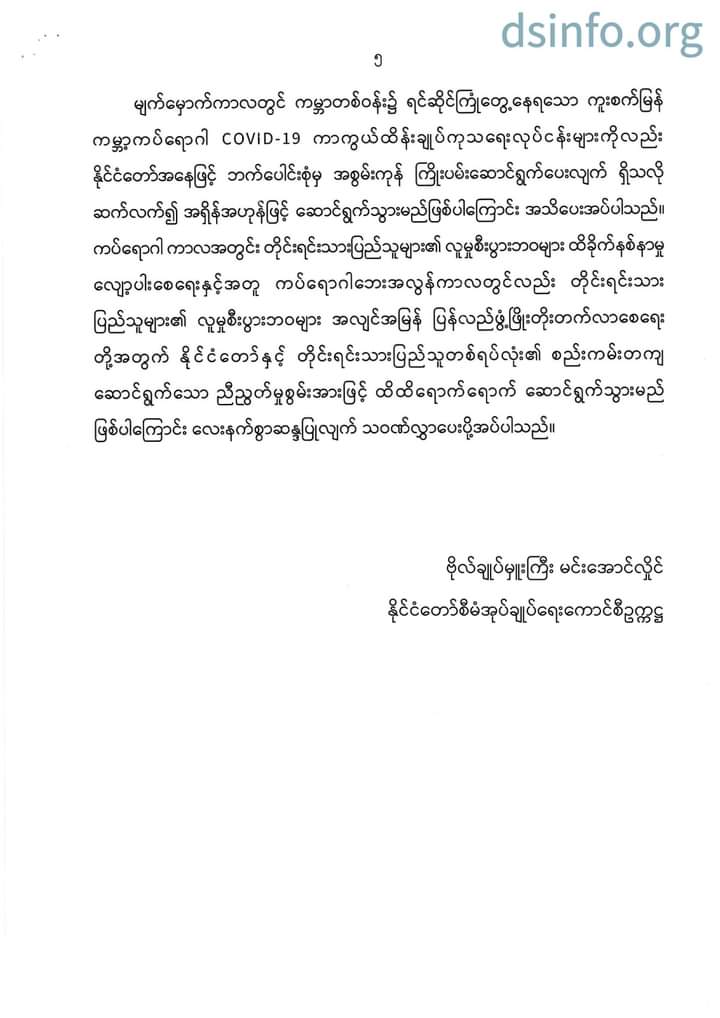 ပြည်ထောင်စုသမ္မတ မြန်မာနိုင်ငံတော် နိုင်ငံတော်စီမံအုပ်ချုပ်ရေးကောင်စီဥက္ကဋ္ဌ ဗိုလ်ချုပ်မှူးကြီး မင်းအောင်လှိုင်ထံ မှ ၂၀၂၁ ခုနှစ်၊ (၇၄) နှစ်မြောက် ပြည်ထောင်စုနေ့ အခမ်းအနားသို့ ပေးပို့သော သဝဏ်လွှာ 02/27/2021