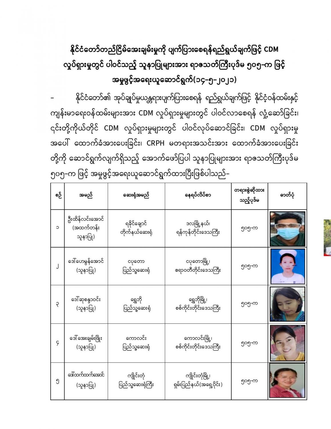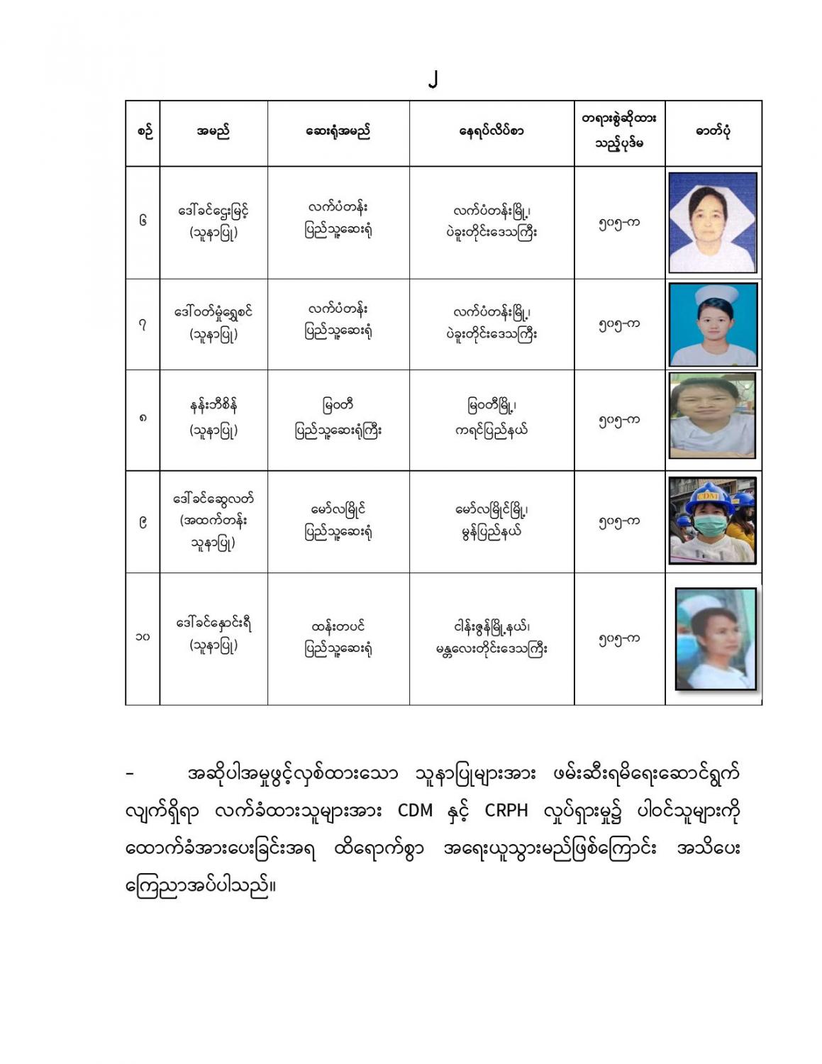 နိုင်ငံတော်တည်ငြိမ်အေးချမ်းမှုကို ပျက်ပြားစေရန်ရည်ရွယ်ချက်ဖြင့် CDM လှုပ်ရှားမှုတွင် ပါဝင်သည့် သူနာပြုများအား ရာဇသတ်ကြီးပုဒ်မ ၅၀၅-က ဖြင့် အမှုဖွင့်အရေးယူဆောင်ရွက်(၁၄-၅-၂၀၂၁)