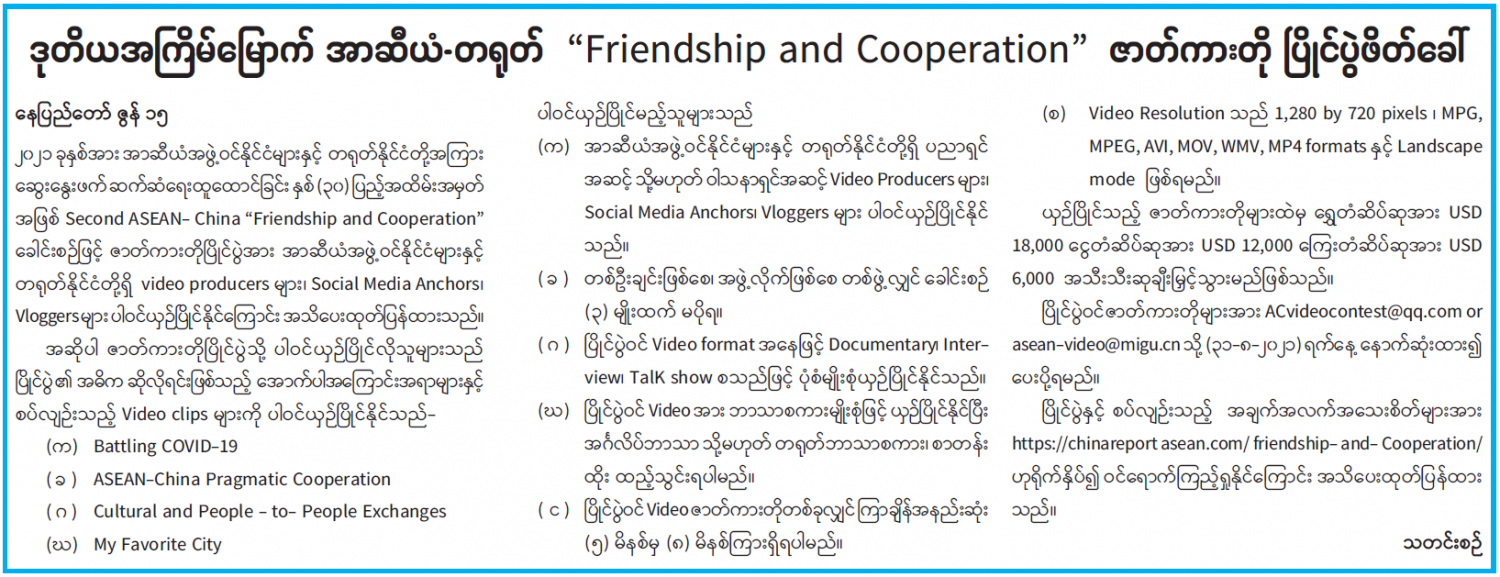 ဒုတိယအကြိမ်မြောက် အာဆီယံ-တရုတ် “Friendship and Cooperation” ဇာတ်ကားတို ပြိုင်ပွဲဖိတ်ခေါ်