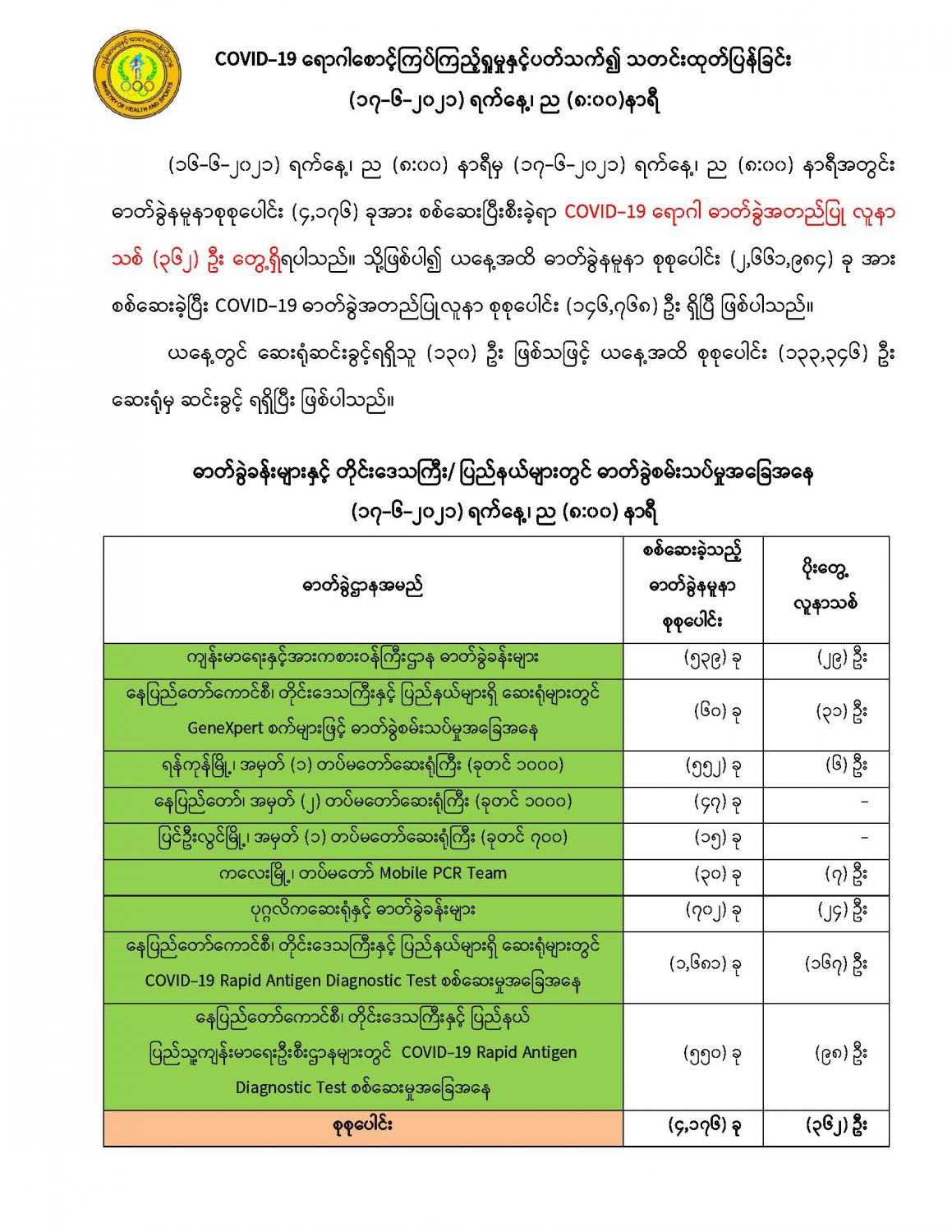 COVID-19 ရောဂါစောင့်ကြပ်ကြည့်ရှုမှုနှင့်ပတ်သက်၍ သတင်းထုတ်ပြန်ခြင်း (၁၇-၆-၂၀၂၁) ရက်နေ့၊ ည (၈:၀၀)နာရီ