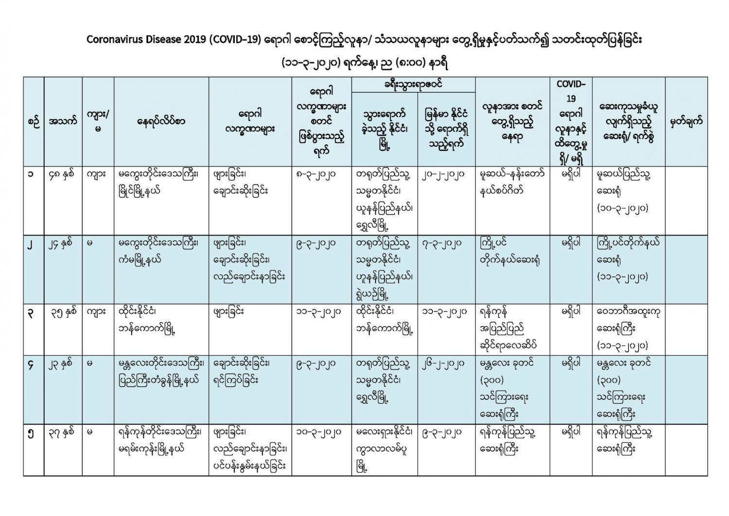 (င) ရန်ကုန်တိုင်းဒေသကြီး၊ မရမ်းကုန်းမြို့နယ်တွင် နေထိုင်သော အသက် (၃၇) နှစ် အရွယ် ဂျပန်နိုင်ငံသား အမျိုးသမီးတစ်ဦးသည် (၉-၃-၂၀၂၀) ရက်နေ့တွင် မလေးရှား နိုင်ငံမှ မြန်မာနိုင်ငံသို့ ပြန်လည်ရောက်ရှိခဲ့ရာ (၁၀-၃-၂၀၂၀) ရက်နေ့မှစတင်၍ ဖျားခြင်း၊ လည်ချောင်း နာခြင်း၊ ပင်ပန်းနွမ်းနယ်ခြင်း လက္ခဏာများခံစားခဲ့ရပြီး (၁၁-၃-၂၀၂၀) ရက်နေ့တွင် ရန်ကုန် ပြည်သူ့ဆေးရုံကြီးသို့ လာရောက်ပြသခဲ့သဖြင့် သီးခြား ထားရှိ ကုသမှုပေးလျက်ရှိပါသည်။