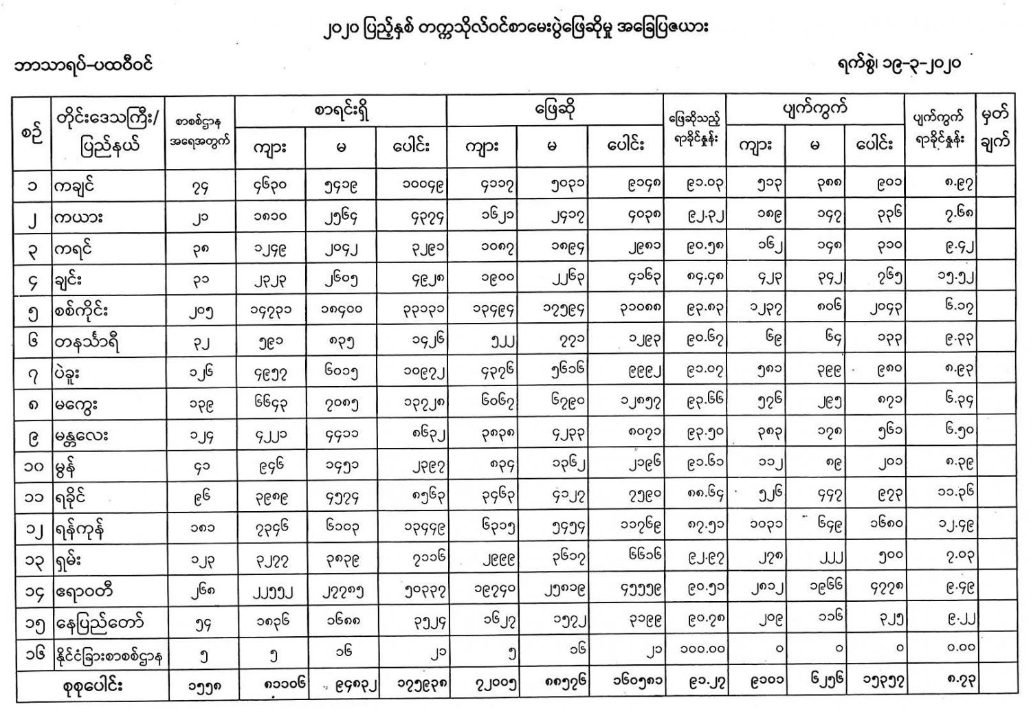 ၂၀၂၀ ပြည့်နှစ် တက္ကသိုလ်ဝင်စာမေးပွဲ အဋ္ဌမနေ့အဖြစ် ပထဝီဝင်ဘာသာရပ်ကို ယနေ့တွင် ဖြေဆိုကြရာ နိုင်ငံခြားစာစစ်ဌာန ၅ ခုနှင့် မြန်မာတစ်နိုင်ငံလုံးရှိ စာစစ်ဌာန ၁၅၅၃ ခု၊ စာစစ်ဌာနစုစုပေါင်း ၁၅၅၈ ခုတွင် ဖြေဆိုသူပေါင်း ၁၆၀၅၈၁ ဦးရှိကြောင်း ပညာရေးဝန်ကြီးဌာနမှ သိရသည်။ တက္ကသိုလ်ဝင်စာမေးပွဲ ပထဝီဝင်ဘာသာရပ်တွင် ဖြေဆိုသူပေါင်း ၁၆၀၅၈၁ ဦးအနက် တစ်နိုင်ငံလုံး၌ ဆေးရုံဖြေဆိုသူ ၂၂ ဦး၊ အကြားအာရုံ မသန်စွမ်းဖြေဆိုသူ ၇ ဦး၊ အမြင်အာရုံ မသန်စွမ်းဖြေဆိုသူ ၃၁ ဦး၊ ကိုယ်အင်္ဂါ မသန်စွမ်းဖြေဆိုသူ ၂၀၊ အကျဉ်းထောင်များတွင် ဝင်ရောက်ဖြေဆိုသူ ၁၁၃ ဦးနှင့် ကရင်ပြည်နယ် မြဝတီမှ ဝင်ရောက်ဖြေဆိုသူ ၁၄ ဦးရှိ ကြောင်း သိရသည်။