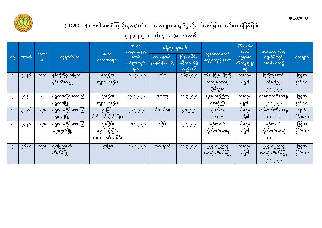 ၁။ ကျန်းမာရေးနှင့် အားကစားဝန်ကြီးဌာနသည် ကမ္ဘာ့နိုင်ငံများတွင် ကူးစက်ပျံ့နှံ့လျက်ရှိသည့် COVID-19 လတ်တလော အသက်ရှူလမ်းကြောင်းဆိုင်ရာ ရောဂါဖြစ်ပွားမှုဖြစ်စဉ်နှင့် ပတ်သက်၍ ရောဂါစောင့်ကြပ်ကြည့်ရှုခြင်းလုပ်ငန်းများအား အပြည်ပြည်ဆိုင်ရာ ဝင်ပေါက်၊ ထွက်ပေါက် ဂိတ်များတွင်လည်းကောင်း၊ ဆေးရုံအခြေပြု အဖြစ်လည်းကောင်း၊ ပြည်သူလူထု အခြေပြု စောင့်ကြပ်ကြည့်ရှုခြင်း လုပ်ငန်းများဖြင့်လည်းကောင်း၊ ပုဂ္ဂလိကဆေးရုံများနှင့် ပူးပေါင်း၍လည်းကောင်း ဆောင်ရွက်လျက် ရှိပါသည်။