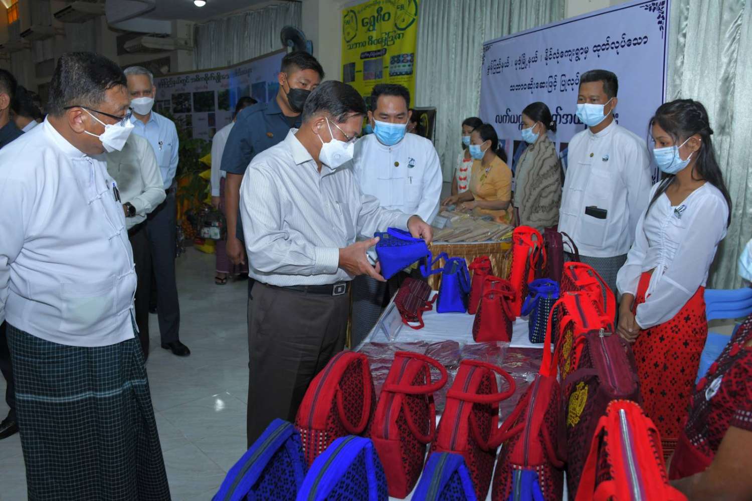 ထို့နောက် နိုင်ငံတော်စီမံအုပ်ချုပ်ရေးကောင်စီဥက္ကဋ္ဌ နိုင်ငံတော်ဝန်ကြီးချုပ်သည် ခင်းကျင်းပြသထားသည့် စားသောက်ကုန်၊ လူသုံးကုန်၊ စက်မှုလက်မှုထုတ်ကုန်၊ ဒေသရိုးရာလက်မှုထုတ်ကုန်များ၊ အဝတ်အထည်များ၊ တိုင်းရင်းဆေးများ စသည့် ထုတ်ကုန်ပစ္စည်းများ ခင်းကျင်းပြသထားရှိမှုများကို ပြကွက်တစ်ခုချင်းစီအလိုက် စိတ်ဝင်တစားဖြင့်လေ့လာခဲ့ပြီး ဈေးကွက်ရရှိမှုအခြေအနေများကို မေးမြန်းဆွေးနွေးရာ လုပ်ငန်းအလိုက် စီးပွားရေးလုပ်ငန်းရှင်များက လိုက်လံရှင်းလင်းတင်ပြခဲ့ကြကြောင်း သတင်းရရှိသည်။