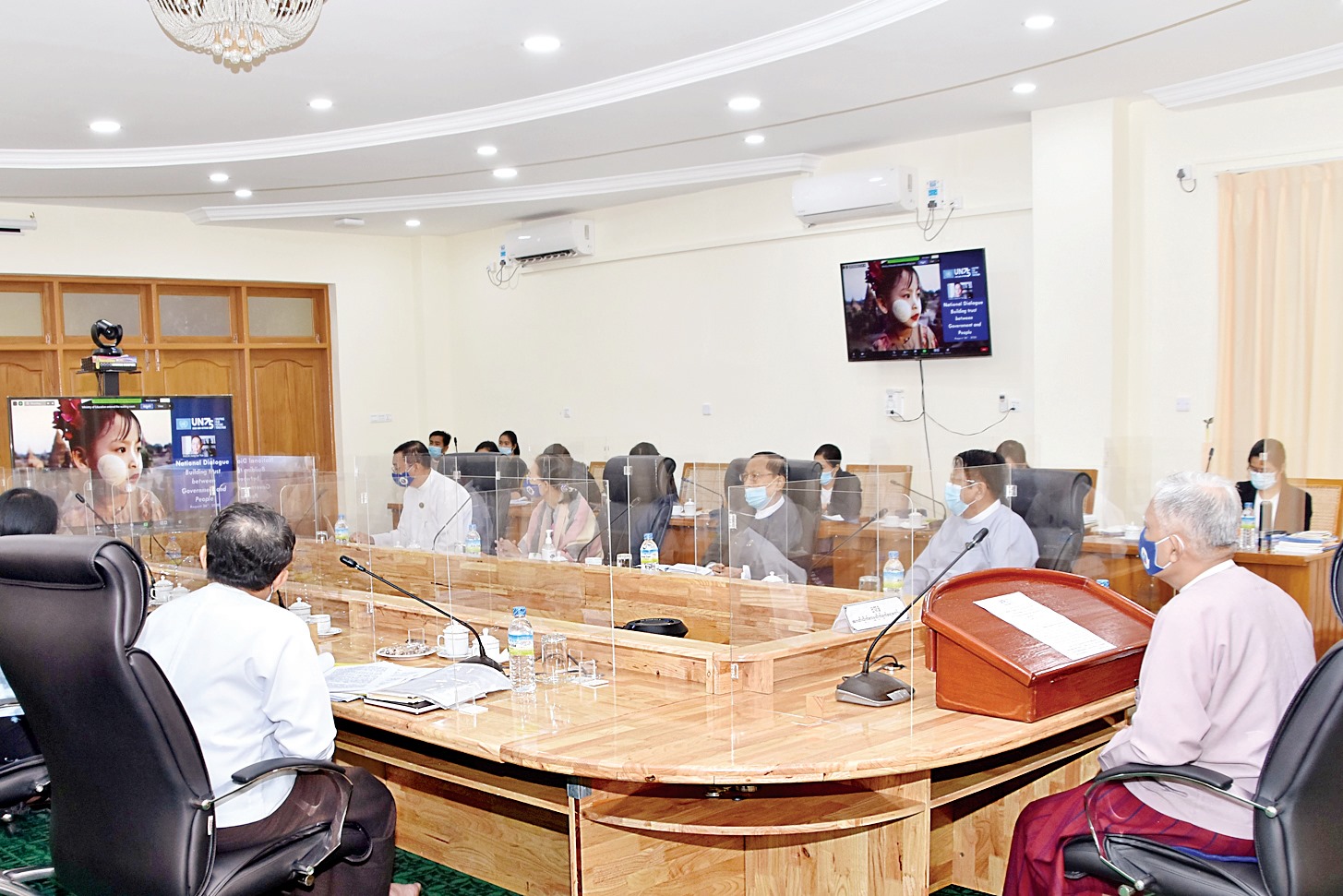 ဆွေးနွေးပွဲတွင် ကော်မရှင်ဥက္ကဋ္ဌ ဦးအောင်ကြည်က UN 75 Initiative ဆိုသည်မှာ အပြည်ပြည်ဆိုင်ရာ အဖွဲ့ အစည်းများအတွက် ဦးစားပေး အစီ အစဉ်များကို ပုံဖော်ရာတွင် တစ်နှစ် အတွင်း ပြုလုပ်သည့် ကမ္ဘာလုံးဆိုင်ရာ ညှိနှိုင်းဆွေးနွေးပွဲများ၌ ကမ္ဘာ့လူထု တစ်ရပ်လုံးက ပါဝင်ဆွေးနွေးနိုင်သည့် အစီအစဉ်တစ်ခုဖြစ်ကြောင်း၊ မိမိတို့ နိုင်ငံအနေဖြင့် ယခုကဲ့သို့ အစိုးရဌာန များ၊ စီးပွားရေးလုပ်ငန်းများနှင့် အရပ်ဘက် လူငယ်အဖွဲ့အစည်းများ ပါဝင်ဆွေးနွေးသဖြင့် UN 75 အမှတ် တံဆိပ်တွင် ဖော်ပြသည့်အတိုင်း ကမ္ဘာ ကြီး၏ အနာဂတ်ကိုပုံဖော်ရာတွင် မိမိတို့အတူတကွ ပူးပေါင်းဆောင်ရွက် နိုင်ကြောင်း၊ ပြည်သူများအနေဖြင့် အစိုးရများအပေါ်တွင် ထားရှိသော မျှော်လင့်ချက်များ၊ အစိုးရများထံမှ လိုလားတောင့်တသော ဝန်ဆောင်မှု များနှင့် ရယူခံစားလိုသော လွတ်လပ် ခွင့်များ တစ်နေ့တခြား ပိုမိုတိုးပွား လာနေခြင်းသည် အစိုးရများ၏ စွမ်းဆောင်နိုင်မှု အခြေအနေနှင့် နှိုင်းချိန် စဉ်းစားပါက ကွာဟမှုများ ရှိနိုင်ကြောင်း၊ ထိုအချက်သည် ဖွံ့ဖြိုး ဆဲနိုင်ငံများတွင်သာမက ဖွံ့ဖြိုးပြီး နိုင်ငံများတွင် မကြာခဏ တွေ့ကြုံ နေရသော စိန်ခေါ်မှုဖြစ်ကြောင်း၊ စိန်ခေါ်မှုကို ရင်ဆိုင်ရာတွင် အစိုးရနှင့် ပြည်သူများ အကြားတွင် ယုံကြည်မှု ခိုင်ခိုင်မာမာ တည်ဆောက်ထားရန် အရေးကြီးပါကြောင်း၊ အစိုးရများ အပေါ် ယုံကြည်မှု တိုးတက်မြင့်မား လာစေရန်အတွက် ကုလသမဂ္ဂ၏ စဉ်ဆက်မပြတ် ဖွံ့ဖြိုးတိုးတက်ရေး ပန်းတိုင်များ (SDGs) အပါအဝင် အပြည်ပြည်ဆိုင်ရာနှင့် ဒေသဆိုင်ရာ မူဝါဒရေးရာ ရည်မှန်းချက်များကို အောင်မြင်စွာ ဆောင်ရွက်ရန် လိုအပ် ပါကြောင်း၊ မိမိတို့နိုင်ငံအနေဖြင့် ရေရှည်တည်တံ့ခိုင်မြဲပြီး ဟန်ချက် ညီသော ဖွံ့ဖြိုးတိုးတက်မှုစီမံကိန်း (MSDP) ကို ငြိမ်းချမ်းရေးနှင့် တည်ငြိမ် မှု၊ သာယာဝပြောမှုနှင့် ပူးပေါင်းဆောင် ရွက်မှု၊ ပြည်သူများနှင့် ကမ္ဘာမြေဟူ၍ မဏ္ဍိုင်ကြီးသုံးရပ်ကို အခြေခံ၍ ရေးဆွဲ ထားကြောင်း၊ ဆွေးနွေးပွဲတွင် ပါဝင် သူများက အတွေ့အကြုံများကို အခြေခံ၍ မိမိတို့၏ သဘောထားအမြင် များကို လွတ်လပ်ပွင့်လင်းစွာ မျှဝေ ဆွေးနွေးကြ စေလိုကြောင်း ပြောကြား သည်။