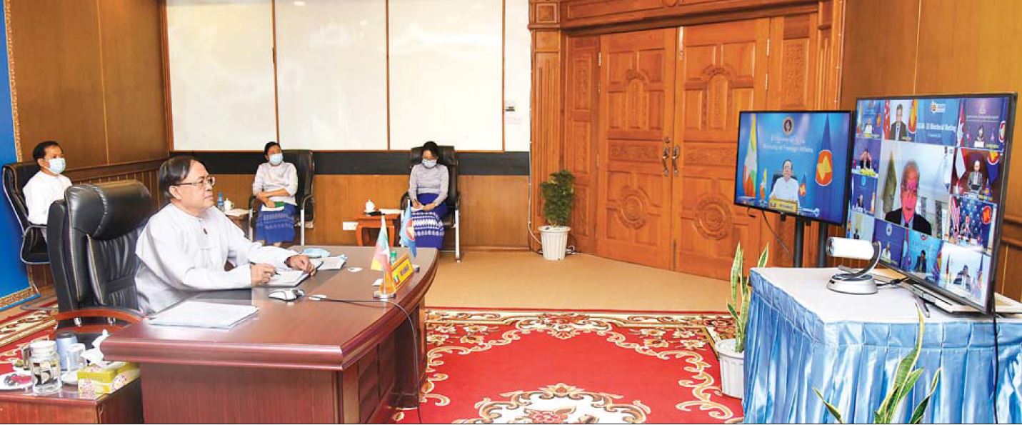 အပြည်ပြည်ဆိုင်ရာပူးပေါင်းဆောင်ရွက်ရေး၀န်ကြီးဌာန၊ ပြည်ထောင်စု၀န်ကြီး ဦးကျော်တင်သည် ယနေ့နံနက် ၇ နာရီခွဲတွင် video conference ဖြင့် ကျင်းပပြုလုပ်သည့် (၂၇) ကြိမ်မြောက် အာဆီယံဒေသဆိုင်ရာဖိုရမ် (အေအာရ်အက်ဖ်) ဝန်ကြီးအဆင့် အစည်းအဝေး၊ အာဆီယံ-ဥရောပသမဂ္ဂ နိုင်ငံခြားရေးဝန်ကြီးများ အစည်းအဝေး၊ အာဆီယံ-အိန္ဒိယ နိုင်ငံခြားရေးဝန်ကြီးများ အစည်းအဝေးတို့သို့ နိုင်ငံခြားရေးဝန်ကြီးဌာန၊ နေပြည်တော်မှ ပါဝင်တက်ရောက်ခဲ့သည်။