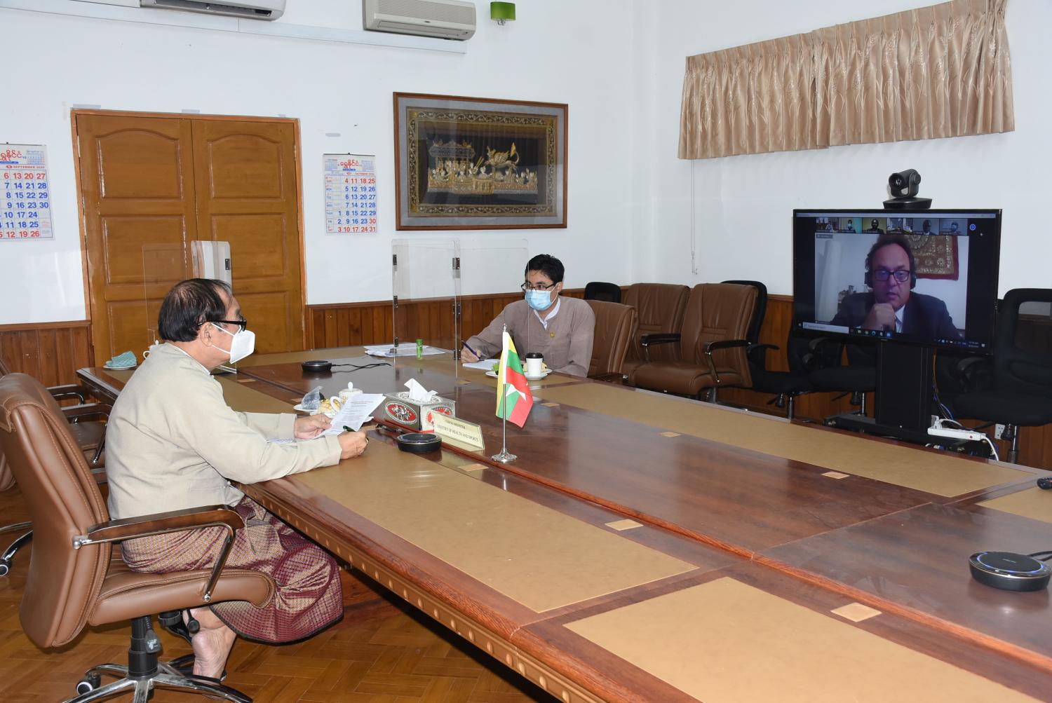 UNOPS အဖွဲ့မှ ဝန်ကြီးဌာန၏ COVID-19 တုံ့ပြန်ဆောင်ရွက်ရေး ဆေးနှင့်ဆေးပစ္စည်းများ ဝယ်ယူ ပံ့ပိုးမှု အခြေအနေ၊ Global Fund ထောက်ပံ့ငွေဖြင့် တီဘီ၊ ခုခံကျ/ကာလ သားနှင့် ငှက်ဖျားရောဂါများ တိုက်ဖျက်ရေး အတွက် (၂၀၂၁-၂၀၂၃) ခုနှစ် အထိ သဘောတူညီ ချက်လက်မှတ် ရေးထိုးရေးကိစ္စများနှင့် စပ်လျဉ်းသည့် ဆွေးနွေး ပွဲကို ယနေ့မွန်းလွဲပိုင်းတွင် ကျန်းမာရေးနှင့် အားကစားဝန်ကြီးဌာန၌ Video Conferencing စနစ်ဖြင့် ကျင်းပသည်။