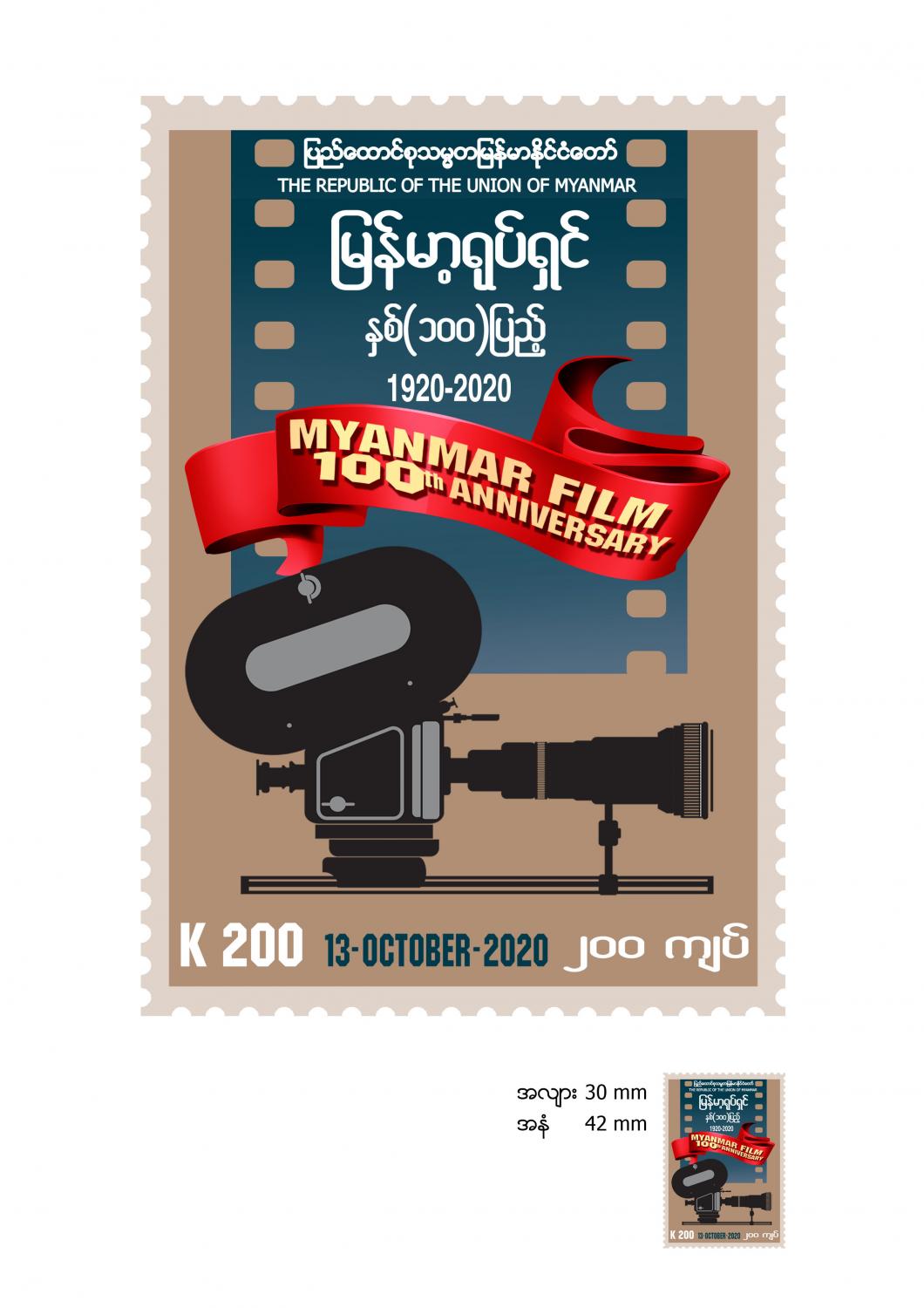 ပို့ဆောင်ရေးနှင့် ဆက်သွယ်ရေးဝန်ကြီးဌာန၊ မြန်မာ့စာတိုက်လုပ်ငန်းမှ မြန်မာ့ရုပ်ရှင် နှစ်(၁၀၀)ပြည့် အခမ်းအနားအထိမ်းအမှတ် (၂၀၀ကျပ်တန်) အထူးထုတ် စာပို့တံဆိပ်ခေါင်းသစ် (၁)မျိုးအား၂၀၂၀ ပြည့်နှစ်၊ အောက်တိုဘာ (၁၃)ရက်၊ မြန်မာသက္ကရာဇ် ၁၃၈၂ ခုနှစ်၊ တော်သလင်း လပြည့်ကျော် (၁၂)ရက် (အင်္ဂါနေ့)၊ နံနက်(၉)နာရီခွဲမှစတင်၍ နေပြည်တော်ဗဟိုစာတိုက်ကြီး၊ ရန်ကုန်စာတိုက်ကြီး၊ မန္တလေးစာတိုက်ကြီးတို့နှင့် တိုင်းဒေသကြီး/ ပြည်နယ်များရှိ မြို့တော် စာတိုက်ကြီးများတွင် ရောင်းချပေးသွားမည် ဖြစ်သည်။