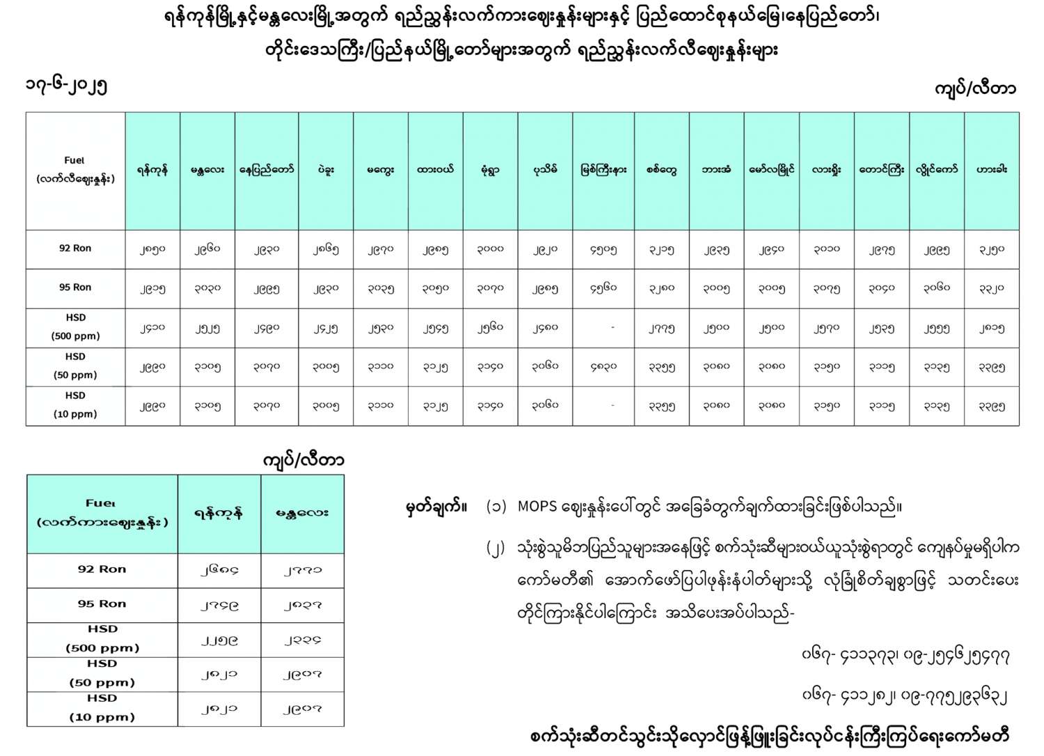 ရန်ကုန်မြို့နှင့် မန္တလေးမြို့အတွက် ရည်ညွှန်းလက်ကားဈေးနှုန်းများနှင့် ပြည်ထောင်စုနယ်မြေ နေပြည်တော်၊ တိုင်းဒေသကြီး/ပြည်နယ် မြို့တော်များအတွက် ရည်ညွှန်းလက်လီဈေးနှုန်းများ 06/17/2025