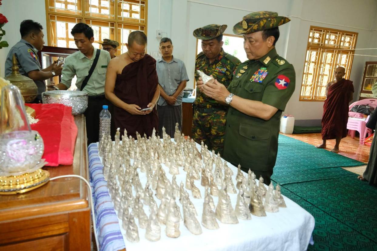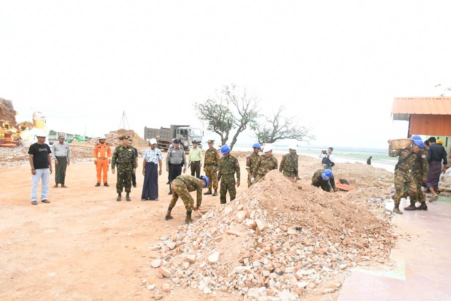 အလားတူ ကာကွယ်ရေးဦးစီးချုပ်ရုံး(ကြည်း)မှ ဒုတိယဗိုလ်ချုပ်ကြီး စိုးတင့်နိုင်နှင့် တာဝန်ရှိသူများသည် ငလျင်ဒဏ်ကြောင့် ထိခိုက်ပျက်စီးမှုများဖြစ်ပေါ်ခဲ့သည့် မန္တလေးမြို့၊ အမရပူရမြို့နယ်၊ တောင်သမန်းကျေးရွာရှိ မဟာသကျရံသီကျောက်တော်ကြီး မြတ်စွာဘုရား၌ အပျက်အစီးများ ဖယ်ရှားရှင်းလင်းနေမှု၊ ပြဿဒ်စေတီတော် တတိယပစ္စယံအထက် ကွန်းတောင်လိုဏ်ဂူအတွင်းမှ ထပ်မံတွေ့ရှိရသော ငွေဆင်းတုတော် (၂၁၉)ဆူ၊ ရွှေဆင်းတုတော် (၁၄)ဆူ၊ ဓာတ်တော်ပုလင်းနှင့် ဓာတ်တော်များ၊ စေတီတော်အတွင်းရှိ ရုပ်ပွားတော်မြတ်ကြီးနှင့် စေတီတော်ကြီးအား ပြုပြင်ဆောင်ရွက်ထားရှိမှုနှင့် ပြုပြင်နေမှုအခြေအနေများကို ကြည့်ရှုစစ်ဆေး၍ လိုအပ်သည်များ ပေါင်းစပ်ညှိနှိုင်းဆောင်ရွက်ပေးသည်။