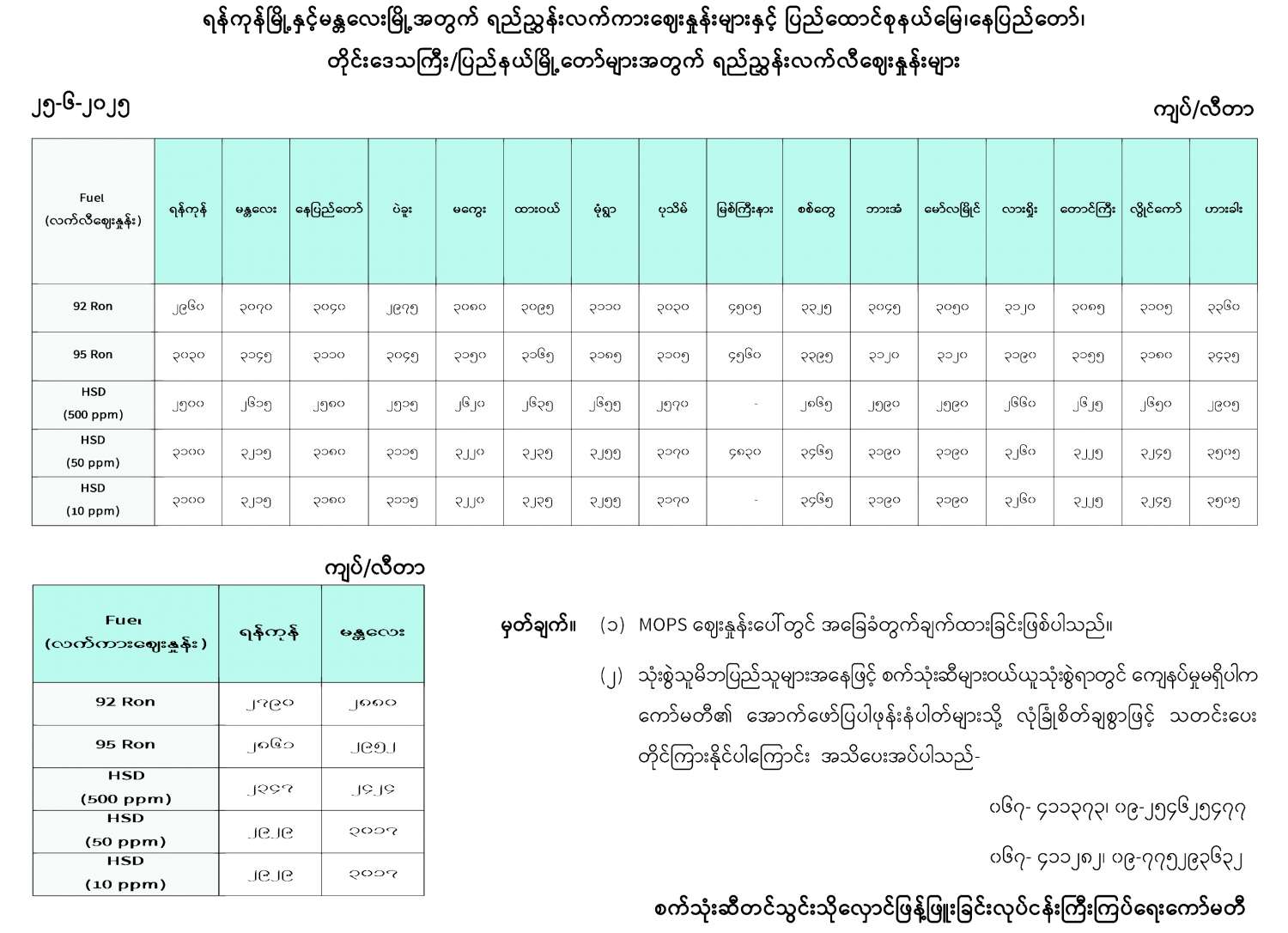 ရန်ကုန်မြို့နှင့် မန္တလေးမြို့အတွက် ရည်ညွှန်းလက်ကားဈေးနှုန်းများနှင့် ပြည်ထောင်စုနယ်မြေ နေပြည်တော်၊ တိုင်းဒေသကြီး/ပြည်နယ် မြို့တော်များအတွက် ရည်ညွှန်းလက်လီဈေးနှုန်းများ 06/25/2025