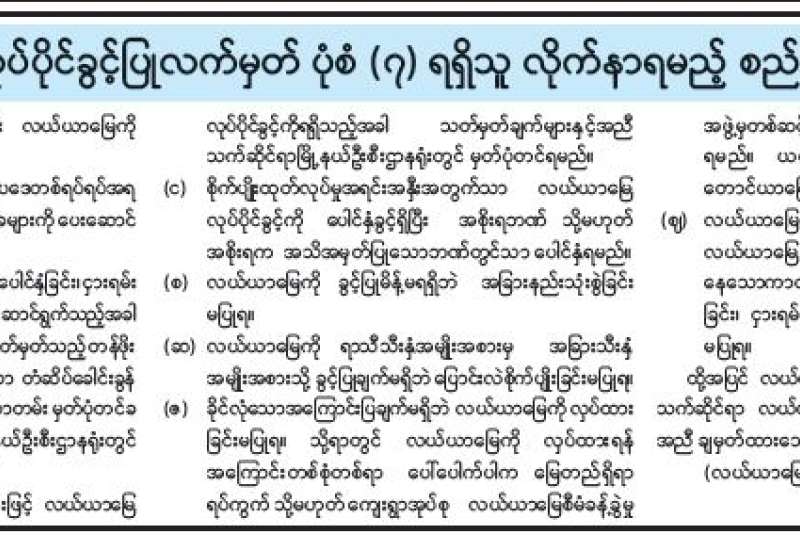 ၂၀၀၈ ခုနှစ် ဖွဲ့စည်းပုံအခြေခံဥပဒေအရ နိုင်ငံတော်သည် သဘာဝပတ်ဝန်းကျင်ကို ကာကွယ်ထိန်းသိမ်းစောင့်ရှောက်ရမည်ဖြစ်သကဲ့သို့ နိုင်ငံသားတိုင်းသည်လည်း သဘာဝပတ်ဝန်းကျင် ထိန်းသိမ်းစောင့်ရှောက်ခြင်းလုပ်ငန်းများတွင် နိုင်ငံတော်အားကူညီရန် တာဝန်ရှိသည့်အလျောက် ပလတ်စတစ်ညစ်ညမ်းမှုကင်းစင်ရေး၊ သဘာဝပတ်ဝန်းကျင်ထိန်းသိမ်းရေးတွင် တာဝန်သိစွာ အားလုံးပါဝင်ဆောင်ရွက်ကြရပါမည့်အကြောင်း။ ။