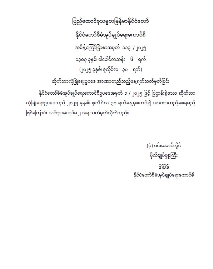 ဆိုက်ဘာလုံခြုံရေးဥပဒေ အာဏာတည်သည့်နေ့ရက်သတ်မှတ်ခြင်း