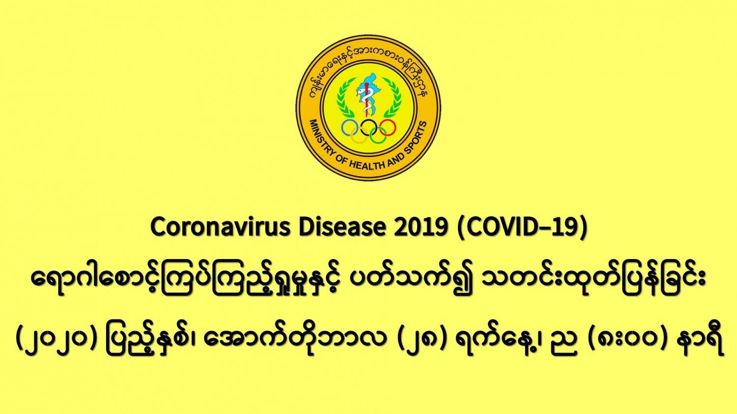 (၂၇-၁၀-၂၀၂၀) ရက်နေ့၊ ည (၈:၀၀) နာရီမှ (၂၈-၁၀-၂၀၂၀) ရက်နေ့၊ ည (၈:၀၀) နာရီ အတွင်း ဓာတ်ခွဲနမူနာ စုစုပေါင်း (၁၄,၂၀၆) ခုအား စစ်ဆေးပြီးစီးခဲ့ရာ COVID-19 ရောဂါ ဓာတ်ခွဲ အတည်ပြု လူနာသစ်(၁,၄၀၆)ဦး တွေ့ရှိရပါသည်။