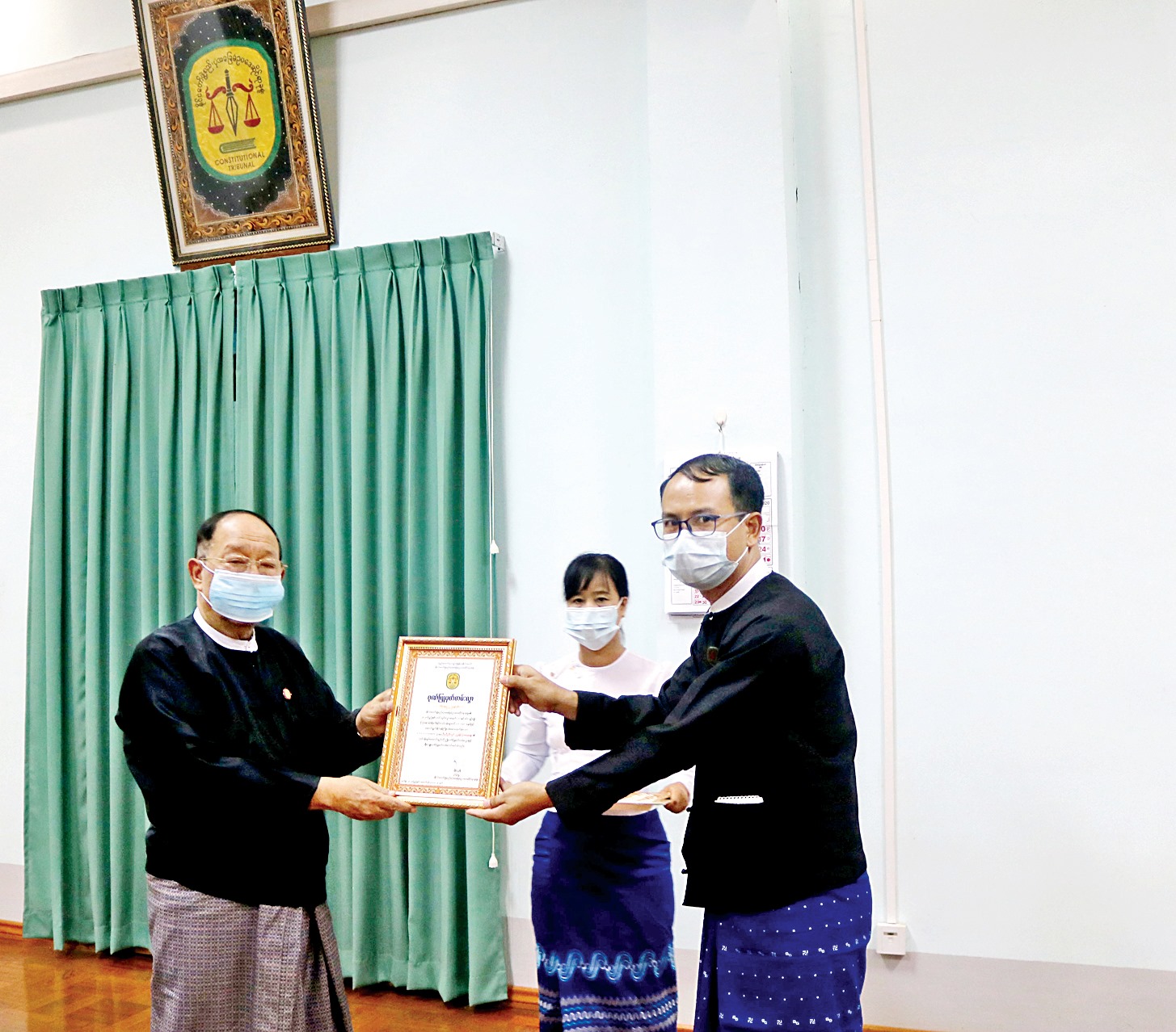 နိုင်ငံတော် ဖွဲ့စည်းပုံအခြေခံဥပဒေဆိုင်ရာခုံရုံးသို့ တင်သွင်းလာသည့် တင်သွင်းလွှာ အမှတ် ၁/၂၀၂၀ ကို e-Court စနစ်ဖြင့် ကြားနာဆုံးဖြတ်ရာတွင် ပါဝင်ဆောင်ရွက်ခဲ့သော e-Government ဌာနနှင့် တရားရေး ဌာနတို့မှ ဝန်ထမ်းများအား ဂုဏ်ပြုမှတ်တမ်းလွှာ ပေးအပ်ချီးမြှင့်ပွဲ အခမ်းအနားကို ယနေ့နံနက် ၁၀ နာရီခွဲက နိုင်ငံတော် ဖွဲ့စည်းပုံအခြေခံ ဥပဒေဆိုင်ရာခုံရုံး အစည်းအဝေးခန်းမ၌ ကျင်းပသည်။