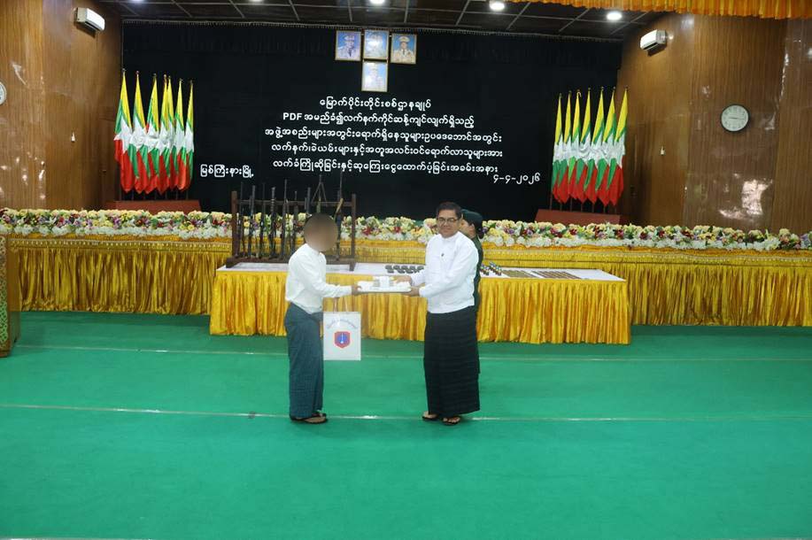နိုင်ငံတော်အစိုးရသည် PDF အပါအဝင် အဖွဲ့အစည်းအမျိုးမျိုးအမည်ခံ၍ လက်နက်ကိုင်ဆန့်ကျင်လျက်ရှိသည့် အဖွဲ့အစည်းများအတွင်း ရောက်ရှိနေသူများအား ဥပဒေဘောင်အတွင်းသို့ ပြန်လည်ဝင်ရောက်ရန်ဖိတ်ခေါ်၍ ဥပဒေဘောင်အတွင်းသို့ ပြန်လည်ဝင်ရောက်လာကြသူများကိုလည်း လိုအပ်သည့် ကူညီပံ့ပိုးမှုများ ဆောင်ရွက်ပေးလျက်ရှိရာ နိုင်ငံတော်နှင့် တပ်မတော်၏ငြိမ်းချမ်းရေးလုပ်ငန်းစဉ်များကို နားလည်သဘောပေါက်လာသည့် KIA KPDF နှင့် PDF အမည်ခံအဖွဲ့မှ အဖွဲ့ဝင်အမျိုးသား ၈ ဦးတို့သည် လက်နက်ခဲယမ်းများနှင့်အတူ ဥပဒေဘောင်အတွင်းသို့ ထပ်မံဝင်ရောက်လာကြသည်။