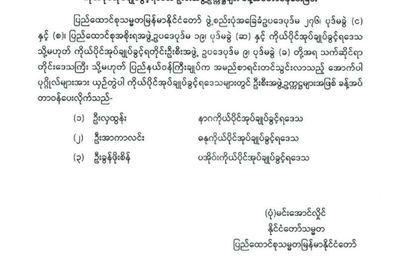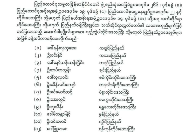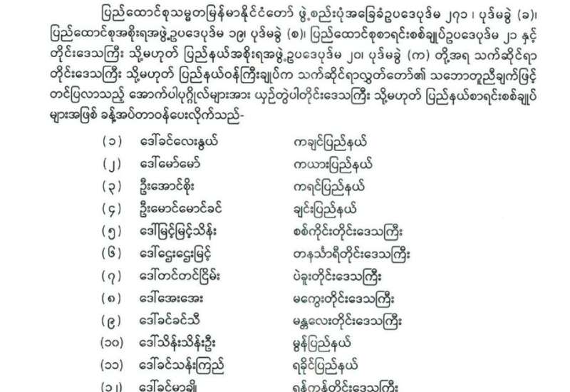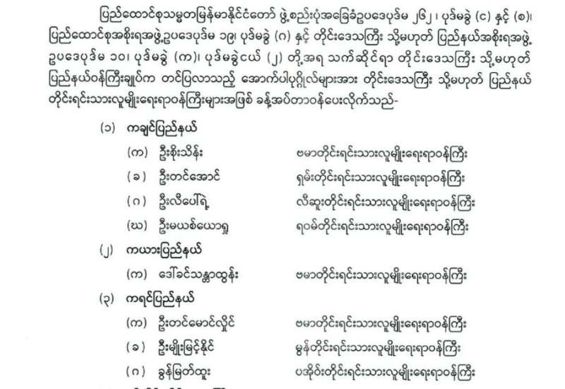 တိုင်းဒေသကြီး သို့မဟုတ် ပြည်နယ်တိုင်းရင်းသားလူမျိုးရေးရာဝန်ကြီးများ ခန့်အပ်တာဝန်ပေးခြင်း