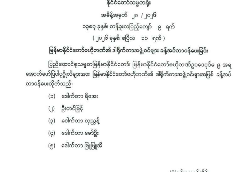 မြန်မာနိုင်ငံတော်ဗဟိုဘဏ်၏ ဒါရိုက်တာအဖွဲ့ဝင်များ ခန့်အပ်တာဝန်ပေးခြင်း