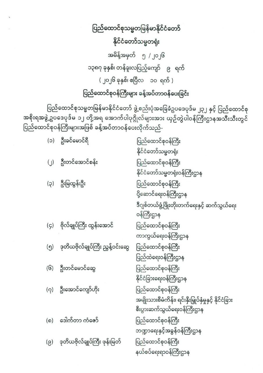 ပြည်ထောင်စုဝန်ကြီးများ ခန့်အပ်တာဝန်ပေးခြင်း