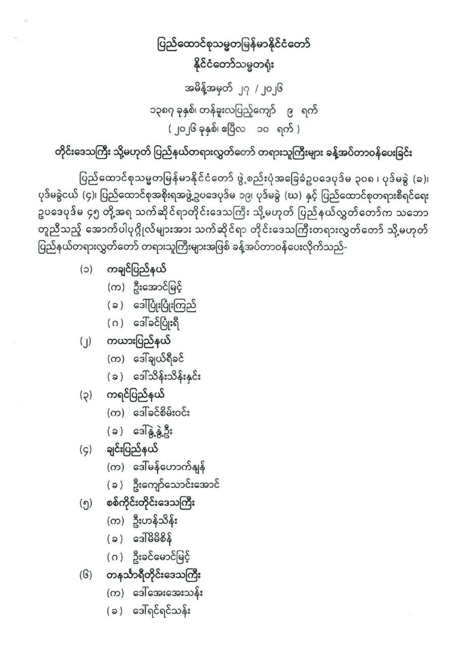 တိုင်းဒေသကြီး သို့မဟုတ် ပြည်နယ်တရားလွှတ်တော် တရားသူကြီးများ ခန့်အပ်တာဝန်ပေးခြင်း