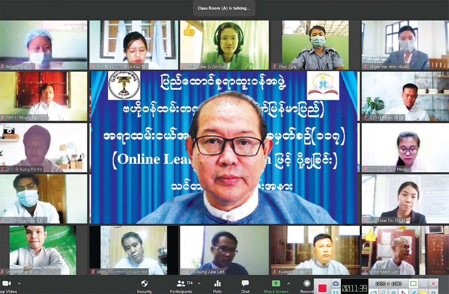 အရာထမ်းငယ် အခြေခံသင်တန်းအမှတ်စဉ်(၁၁၇)ကို Online Learning System ဖြင့် ဖွင့်လှစ်ပို့ချခြင်း သင်တန်းဖွင့်ပွဲအခမ်းအနားကို ယနေ့ နံနက် ၈ နာရီ တွင် ရန်ကုန်တိုင်းဒေသကြီး လှည်းကူးမြို့နယ် ဗဟို ဝန်ထမ်းတက္ကသိုလ် (အောက်မြန်မာပြည်) တွင် ကျင်းပရာ ပါမောက္ခချုပ် ဦးကျော်ဝင်းဟန်က သင်တန်းဖွင့်အမှာစကား ပြောကြားပြီး (ဝဲအောက်ပုံ)ဒုတိယ ပါမောက္ခချုပ်များ၊ ဌာနကြီးမှူးများ၊ ပညာရေးဌာနများမှ ပါမောက္ခများ၊ သင်ကြားပို့ချမည့် ဆရာ ဆရာမများနှင့် သင်တန်းသား သင်တန်းသူများ တက်ရောက်ကြသည်။