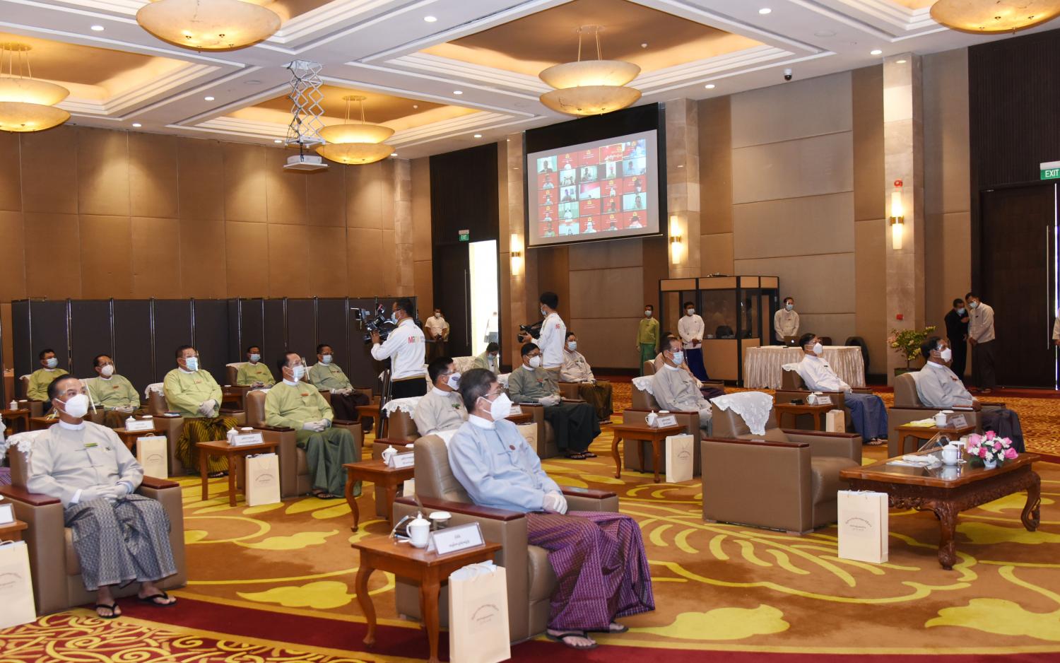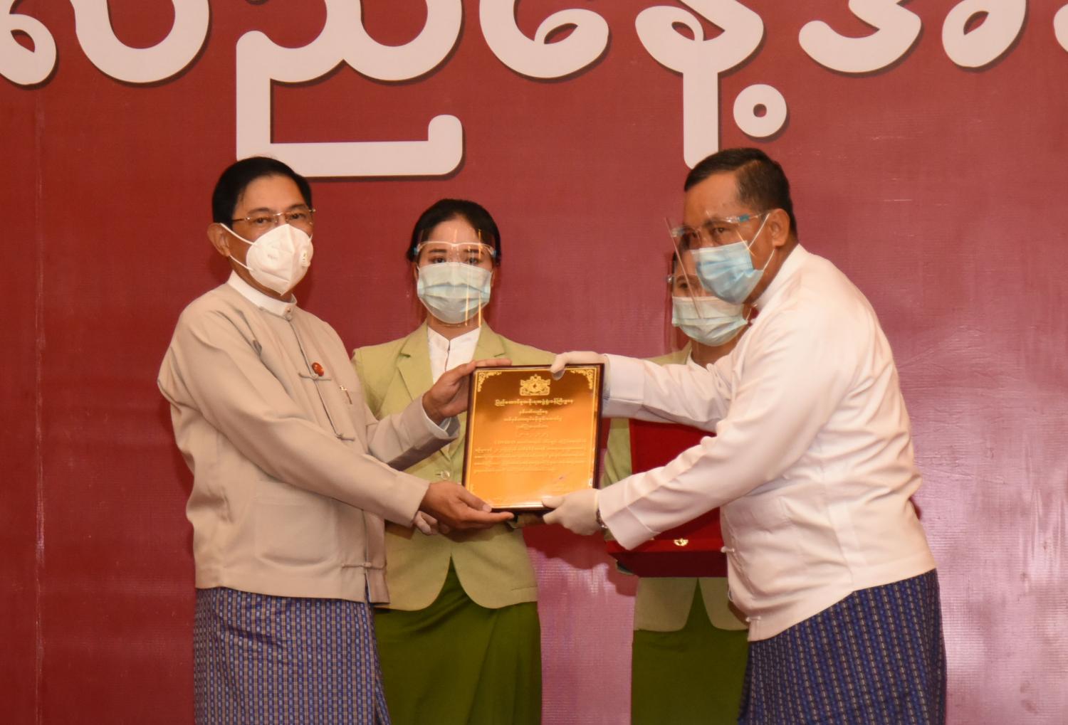 ထို့နောက် ပြည်ထောင်စုဝန်ကြီး ဦးမင်းသူက ကိုဗစ်-၁၉ ရောဂါ ကာကွယ် ထိန်းချုပ်၊ တုံ့ပြန်ရေး လုပ်ငန်းစဉ်များအား စွမ်းစွမ်းတမံ ကူညီဆောင်ရွက်ခဲ့သည့် အစိုးရအဖွဲ့ရေးရာ ဌာနကိုယ်စား ဒုတိယညွှန်ကြားရေးမှူးချုပ် ဦးအောင်စိုးသိန်း ကိုလည်းကောင်း၊ ကိုဗစ်-၁၉ ရောဂါ ကာကွယ်ထိန်းချုပ်၊ တုံ့ပြန်ရေး လုပ်ငန်းစဉ်များနှင့် အထွေထွေရွေးကောက်ပွဲ အောင်မြင်စွာ ကျင်းပပြုလုပ်နိုင်ရေးနှင့် စပ်လျဉ်းသည့် အုပ်ချုပ်ရေးလုပ်ငန်းစဉ်များကို စွမ်းစွမ်းတမံပံ့ပိုးကူညီ ဆောင်ရွက်ခဲ့သည့် အထွေထွေအုပ်ချုပ်ရေးဦးစီးဌာနကိုယ်စား ညွှန်ကြားရေးမှူးချုပ် ဦးမြင့်သန်းကို လည်းကောင်း၊ ကိုဗစ်-၁၉ ရောဂါ ကာကွယ်၊ ထိန်းချုပ်၊ တုံ့ပြန်ရေးလုပ်ငန်းစဉ်များအား ကူညီဆောင်ရွက်ခဲ့သည့် အခွန်အယူခံခုံအဖွဲ့ရုံးကိုယ်စား ညွှန်ကြားရေးမှူးချုပ် ဦးအောင်မြင့်လွင်အား လည်းကောင်း ဂုဏ်ပြုဆုတံဆိပ်များ ပေးအပ်ချီးမြှင့်သည်။