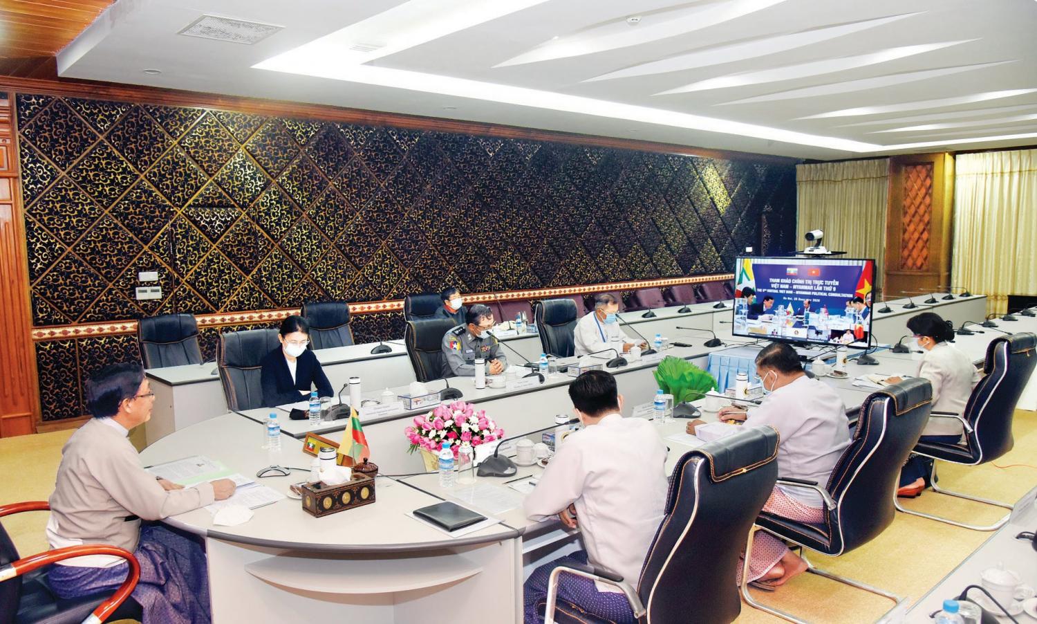 (၉)ကြိမ်မြောက် မြန်မာ-ဗီယက်နမ် နိုင်ငံခြားရေးဝန်ကြီးဌာနများအကြား မူဝါဒရေးရာညှိနှိုင်း ဆွေးနွေးပွဲကို ယနေ့ နံနက် ၉ နာရီခွဲတွင် နေပြည်တော်ရှိ နိုင်ငံခြားရေးဝန်ကြီးဌာန၌ ဗီဒီယိုကွန်ဖရင့်ဖြင့် ကျင်းပသည်။