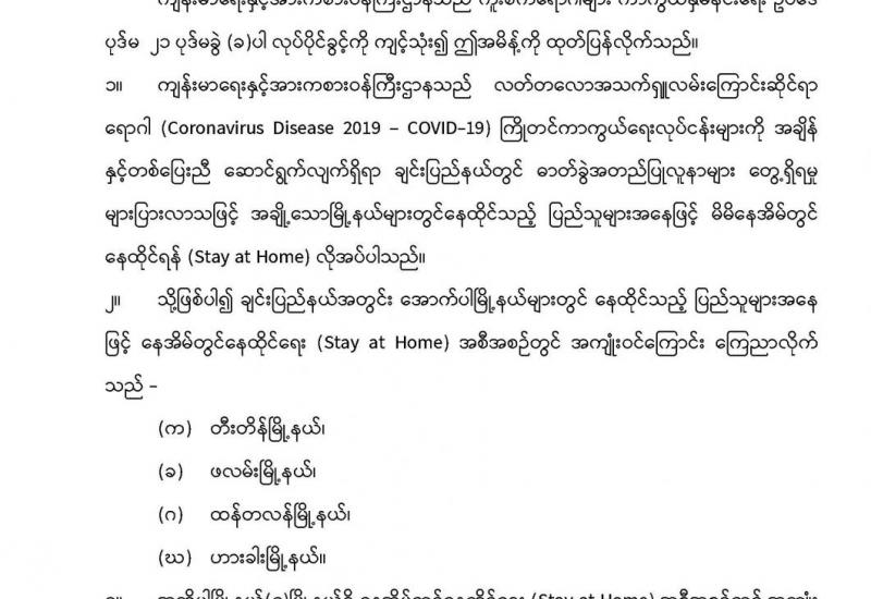 မြန်မာနိုင်ငံတွင် မေလ ၂၇ ရက်နေ့မှစတင်၍ ကိုဗစ်-၁၉ ရောဂါကူးစက်မှု အစုလိုက် ဖြစ်ပွားလာခဲ့သည်။ အစုလိုက်ဖြစ်ပွားလာရခြင်းမှာ မြန်မာနိုင်ငံ၏အနောက်ဘက် နယ်စပ်မြို့အချို့တွင် စတင်တွေ့ရှိလာရပြီး ယခုအခါ အဆိုပါမြို့များကို နေအိမ်အတွင်းသာ နေထိုင်ရေး (Stay at Home) အစီအစဉ်ထုတ်ပြန်ကာ ရောဂါကာကွယ် ထိန်းချုပ်ရေးကို အလေးထားဆောင်ရွက်လျက်ရှိသည်။