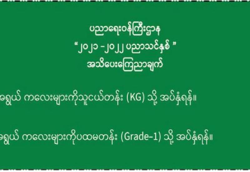 ပညာရေးဝန်ကြီးဌာန၏ ၂၀၂၁-၂၀၂၂ ပညာသင်နှစ် အခြေခံပညာ အထက်တန်း၊ အလယ်တန်း၊ မူလတန်းကျောင်းများကို ၂၀၂၁ ခုနှစ်၊ ဇွန် ၁ ရက်မှစတင်၍ ပုံမှန်စာသင်နှစ်အတိုင်း ဖွင့်လှစ် မည်ဖြစ်ကြောင်း၊ ကျောင်းအပ်နှံရေး သီတင်းပတ်အဖြစ် ၂၀၂၁ ခုနှစ်၊ မေ ၂၄ ရက် (တနင်္လာနေ့) မှ ၃၁ ရက် (တနင်္လာနေ့)အထိ သတ်မှတ်ထားသဖြင့် ယင်းကာလအတွင်း အတန်းအားလုံး ကျောင်းအပ်နှံကြရန်နှင့် ကျောင်းအပ်နှံရာတွင် မည်သည့်အခကြေးငွေ လုံးဝ (လုံးဝ) ကောက်ခံမှု မရှိကြောင်း၊ ကျောင်းအပ်နှံ သည့်ကျောင်းသားအားလုံးကို ကျောင်းသုံး ပြဋ္ဌာန်းစာအုပ်များ၊ ဗလာစာအုပ်များ၊ ဘောပင်၊ ခဲတံများနှင့် COVID-19 ကြိုတင်ကာကွယ်ရေးအတွက် Mask နှင့် Face Shield များကို အခမဲ့ထောက်ပံ့ ပေးသွားမည်ဖြစ်ကြောင်း ပညာရေးဝန်ကြီးဌာနမှသတင်း ရရှိသည်။