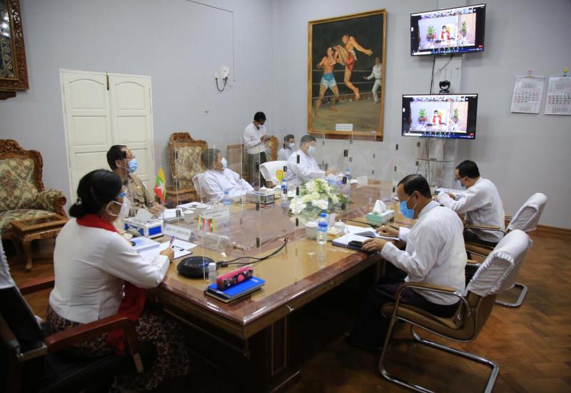 ရန်ကုန်တိုင်းဒေသကြီးတွင် လက်ရှိဆောင်ရွက်နေသည့် ကိုဗစ်-၁၉ ကာကွယ်၊ ထိန်းချုပ်၊ ကုသရေး လုပ်ငန်းများ ဆန်းစစ်သုံးသပ်မှု အစည်းအဝေးကို ယနေ့မွန်းလွဲပိုင်းတွင် Videoconferencing စနစ်ဖြင့် ကျင်းပသည်။
