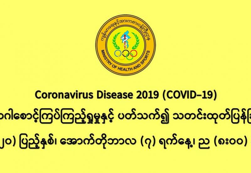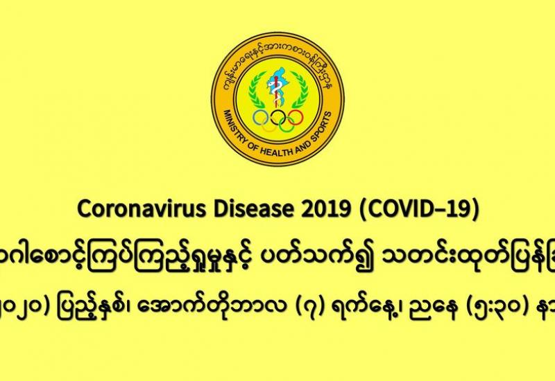 (၆-၁၀-၂၀၂၀) ရက်နေ့၊ ည (၈:၀၀)နာရီမှ (၇-၁၀-၂၀၂၀) ရက်နေ့၊ ည (၈:၀၀)နာရီအတွင်း ဓာတ်ခွဲနမူနာ စုစုပေါင်း (၁၂,၃၂၂) ခုအား စစ်ဆေးပြီးစီးခဲ့ရာ COVID-19 ရောဂါ ဓာတ်ခွဲ အတည်ပြု လူနာသစ် (၁,၄၀၀)ဦး တွေ့ရှိရပါသည်။