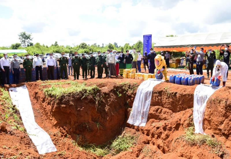 ရှမ်းပြည်နယ်(တောင်ပိုင်း)၊ လွိုင်လင်ခရိုင်၊ ခိုလမ်နယ်မြေရဲစခန်းမှ ဖမ်းဆီးရမိသော မူးယစ်ဆေးဝါးချက်လုပ်ရာတွင် အသုံးပြုမည့် အက်စစ်ပုံးများ ဖျက်ဆီးခြင်းကို ယ‌နေ့ နံနက်(၁၁) နာရီက ခိုလမ်-ကျိုင်းတောင်းကားလမ်းမဘေးတွင် ကျင်းပသည်။