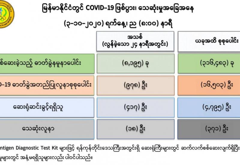 (၂-၁၀-၂၀၂၀) ရက်နေ့၊ ည (၈:၀၀)နာရီမှ (၃-၁၀-၂၀၂၀) ရက်နေ့၊ ည (၈:၀၀)နာရီ အတွင်း ဓာတ်ခွဲနမူနာ စုစုပေါင်း (၈,၁၉၅) ခုအား စစ်ဆေးပြီးစီးခဲ့ရာ COVID-19 ရောဂါ ဓာတ်ခွဲအတည်ပြု လူနာသစ် (၉၇၈)ဦး တွေ့ရှိရပါသည်။