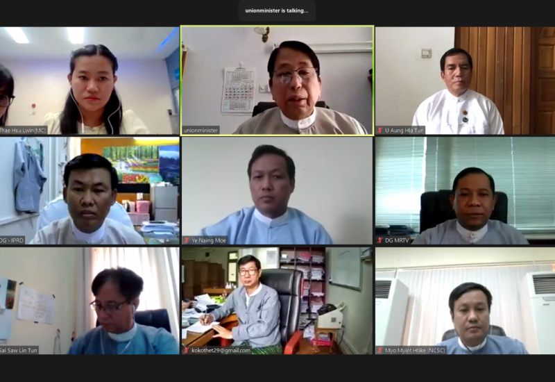 မြန်မာနိုင်ငံ ဒစ်ဂျစ်တယ်မီဒီယာအသင်း ဖြစ်မြောက်ရေးကော်မတီက ကြီးမှူးကျင်းပသည့် ဒစ်ဂျစ်တယ်မီဒီယာ ရေစီးနှင့် အခွင့်အလမ်းများဆိုင်ရာ အွန်လိုင်းဆွေးနွေးပွဲ (Digital Media Trends and Opportunities Webinar) ကို ယနေ့ မွန်းလွဲ ၁ နာရီတွင် ပြုလုပ်ရာ ပြန်ကြားရေးဝန်ကြီးဌာန ပြည်ထောင်စုဝန်ကြီး ဒေါက်တာဖေမြင့်၊ ဒုတိယဝန်ကြီး ဦးအောင်လှထွန်း၊ အမြဲတမ်းအတွင်းဝန် ဦးမျိုးမြင့်မောင်၊ ဌာနဆိုင်ရာအကြီးအကဲများနှင့် မြန်မာနိုင်ငံ ဒစ်ဂျစ်တယ်အသင်းဖြစ်မြောက်ရေး ကော်မတီဝင်များ၊ သတင်းမီဒီယာသမားများနှင့် စိတ်ပါဝင်စားသူများက သက်ဆိုင်ရာနေရာ အသီးသီးမှ ဗီဒီယိုကွန်ဖရင့်စနစ်ဖြင့် တက်ရောက်ကြသည်။