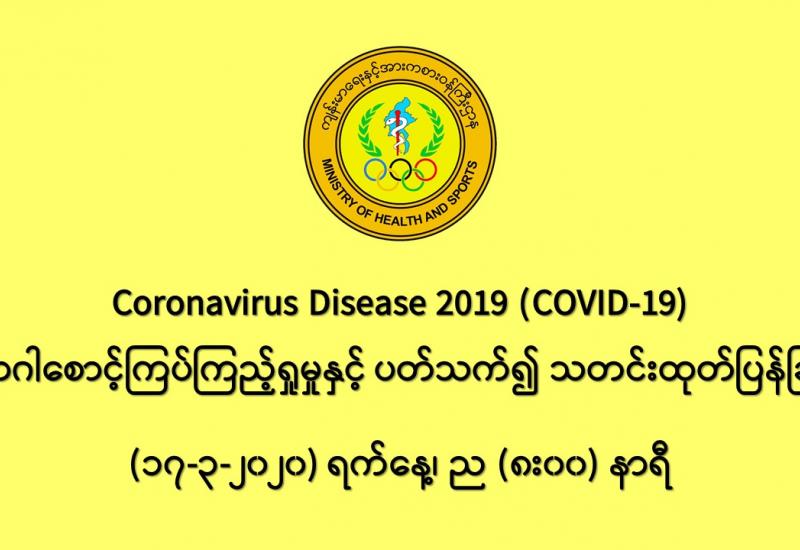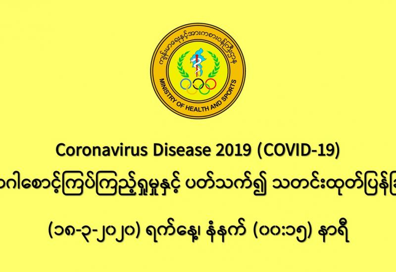 ၁။ ကျန်းမာရေးနှင့် အားကစားဝန်ကြီးဌာနသည် ကမ္ဘာ့နိုင်ငံများတွင် ကူးစက်ပျံ့နှံ့လျက်ရှိသည့် COVID-19 လတ်တလော အသက်ရှူလမ်းကြောင်းဆိုင်ရာ ရောဂါဖြစ်ပွားမှုဖြစ်စဉ်နှင့် ပတ်သက်၍ ရောဂါစောင့်ကြပ် ကြည့်ရှုခြင်း လုပ်ငန်းများအား အပြည်ပြည်ဆိုင်ရာ ဝင်ပေါက်၊ ထွက်ပေါက်ဂိတ် များတွင်လည်းကောင်း၊ ဆေးရုံအခြေပြုအဖြစ်လည်းကောင်း၊ ပြည်သူလူထုအခြေပြု စောင့်ကြပ် ကြည့်ရှုခြင်း လုပ်ငန်းများဖြင့်လည်းကောင်း၊ ပုဂ္ဂလိကဆေးရုံများနှင့် ပူးပေါင်း၍လည်းကောင်း ဆောင်ရွက်လျက် ရှိပါသည်။