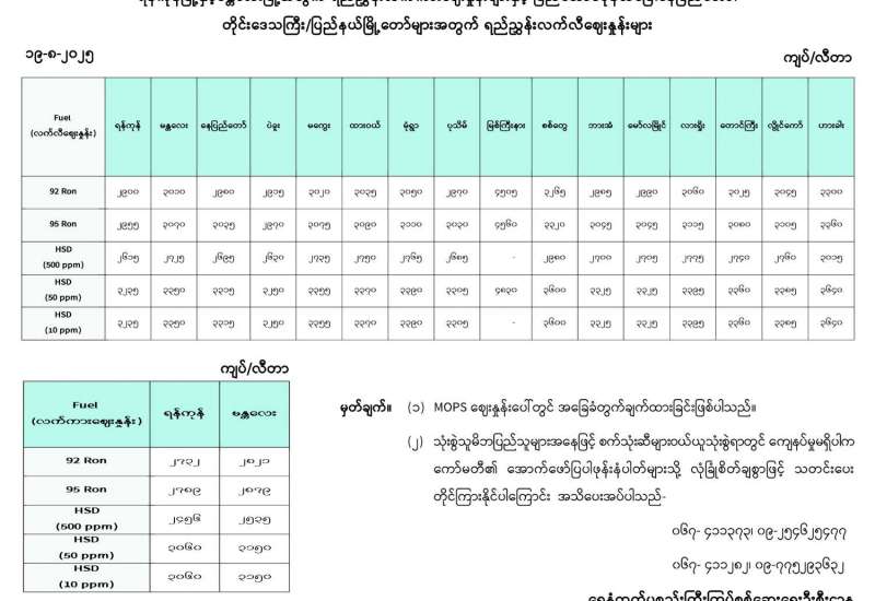 ရန်ကုန်မြို့နှင့် မန္တလေးမြို့အတွက် ရည်ညွှန်းလက်ကားဈေးနှုန်းများနှင့် ပြည်ထောင်စုနယ်မြေ နေပြည်တော်၊ တိုင်းဒေသကြီး/ပြည်နယ် မြို့တော်များအတွက် ရည်ညွှန်းလက်လီဈေးနှုန်းများ