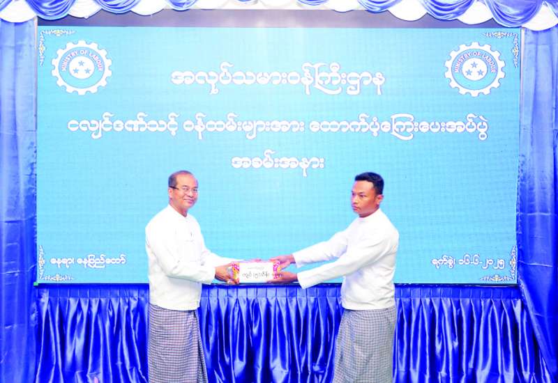 အလုပ်သမားဝန်ကြီးဌာန လက်အောက်ရှိ ဦးစီးဌာန/အဖွဲ့ ရုံးများမှ ငလျင်ဒဏ်သင့်ဝန်ထမ်းများအား ထောက်ပံ့ငွေများ ပေးအပ်ခြင်းအခမ်းအနားကို ယနေ့မွန်းလွဲပိုင်းတွင် အဆိုပါဝန်ကြီး ဌာန၌ကျင်းပရာ ဒုတိယဝန်ကြီး ဦးဝင်းရှိန်၊ အမြဲတမ်းအတွင်းဝန်၊ ညွှန်ကြားရေးမှူးချုပ်များ၊ တာဝန်ရှိသူများနှင့် ငလျင်ဒဏ်သင့် ဝန်ထမ်းများ တက်ရောက်ကြသည်။