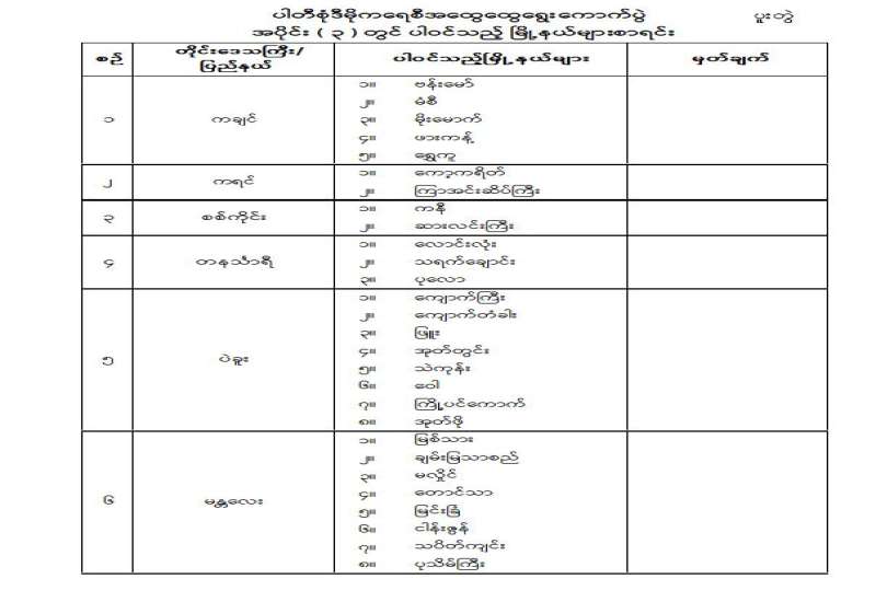 ၁။ ပြည်ထောင်စုရွေးကောက်ပွဲကော်မရှင်သည် ၂၀၂၅ ခုနှစ်၊ ဒီဇင်ဘာလ ၂၈ ရက်နေ့တွင် စတင်ကျင်းပပြုလုပ်မည့် ပါတီစုံဒီမိုကရေစီအထွေထွေရွေးကောက်ပွဲ အပိုင်း(၁)တွင် ပါဝင်သည့်မြို့နယ် (၁၀၂) မြို့နယ်ကို ၂၀၂၅ ခုနှစ်၊ ဩဂုတ်လ ၂၀ ရက်နေ့တွင် ကြေညာချက်အမှတ် (၅၆/၂၀၂၅) ဖြင့်လည်းကောင်း၊ ၂၀၂၆ ခုနှစ်၊ ဇန်နဝါရီလ ၁၁ ရက်နေ့တွင် ကျင်းပပြုလုပ်မည့် ရွေးကောက်ပွဲအပိုင်း (၂)တွင် ပါဝင်သည့် မြို့နယ်(၁၀၀)မြို့နယ်ကို ၂၀၂၅ ခုနှစ်၊ အောက်တိုဘာလ ၂၈ ရက်နေ့တွင် ကြေညာချက်အမှတ် (၁၄၁/၂၀၂၅) ဖြင့်လည်းကောင်း သတ်မှတ်ကြေညာခဲ့ပြီး ဖြစ်ပါသည်။