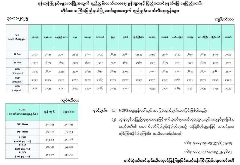 ရန်ကုန်မြို့နှင့် မန္တလေးမြို့အတွက် ရည်ညွှန်းလက်ကားဈေးနှုန်းများနှင့် ပြည်ထောင်စုနယ်မြေ နေပြည်တော်၊ တိုင်းဒေသကြီး/ပြည်နယ် မြို့တော်များအတွက် ရည်ညွှန်းလက်လီဈေးနှုန်းများ
