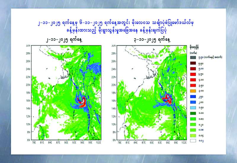 ယနေ့မွန်းလွဲ ၃ နာရီခွဲ တိုင်းထွာချက်များအရ အရှေ့ဘက်မှ ရွေ့လျားလာသော လေပွေလှိုင်းများ၏အရှိန်ကြောင့်လည်းကောင်း၊ ကပ္ပလီပင်လယ်ပြင်မြောက်ပိုင်းနှင့် ယင်းနှင့်ဆက်စပ်လျက်ရှိသော ဘင်္ဂလားပင်လယ်အော်အရှေ့အလယ်ပိုင်းတို့တွင် ဖြစ်ပေါ်နေသော လေဖိအားနည်းရပ်ဝန်း၏အရှိန်ကြောင့်လည်းကောင်း နိုဝင်ဘာ ၂ ရက် မှ ၆ ရက်အတွင်း နေပြည်တော်၊ ရန်ကုန်တိုင်းဒေသကြီး၊ မန္တလေးတိုင်းဒေသကြီး၊ ပဲခူးတိုင်းဒေသကြီး၊ မကွေးတိုင်းဒေသကြီး၊ စစ်ကိုင်းတိုင်းဒေသကြီး၊ ဧရာဝတီတိုင်းဒေသကြီး၊ တနင်္သာရီတိုင်းဒေသကြီး၊ ကချင်ပြည်နယ်၊ ကယားပြည်နယ်၊ ကရင်ပြည်နယ်၊ ချင်းပြည်နယ်၊ မွန်ပြည်နယ်၊ ရခိုင်ပြည်နယ်နှင့် ရှမ်းပြည်နယ်တို့တွင် နေရာစိပ်စိပ်မှ နေရာအနှံ့အပြားမိုးထစ်ချုန်းရွာပြီး အချို့ဒေသများတွင် ဒေသအလိုက်နှင့် နေရာကွက်၍ မိုးကြီးခြင်းများ ဖြစ်ပေါ်နိုင်သည်။