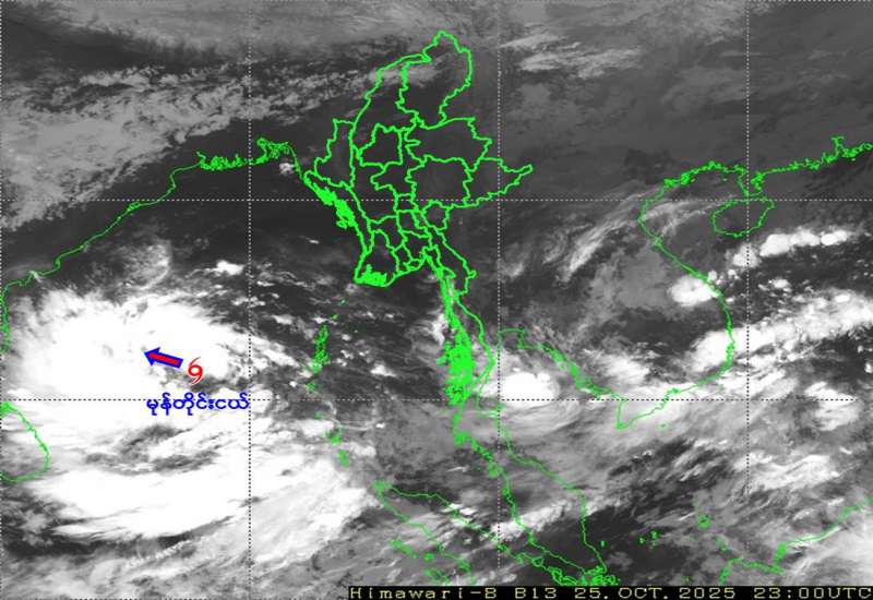 ဘင်္ဂလားပင်လယ်အော်အခြေအနေ။ ယနေ့မြန်မာစံတော်ချိန် ၀၅:၃၀ နာရီအချိန် တိုင်းထွာချက်များအရ ဘင်္ဂလားပင်လယ်အော် အရှေ့တောင်ပိုင်းတွင် ဖြစ်ပေါ်နေသော မုန်တိုင်းငယ် (Depression) သည် ဆက်လက်တည်ရှိနေပါသည်။ အဆိုပါ မုန်တိုင်းငယ် သည် မြန်မာနိုင်ငံ၊ ကိုကိုးကျွန်းမြို့ (Coco Island) ၏ အနောက်တောင်ဘက် ရေမိုင် ၄၀၀ မိုင်ခန့်၊ အိန္ဒိယနိုင်ငံ၊ ချင်းနိုင်မြို့ (Chennai) ၏ အရှေ့-အရှေ့တောင်ဘက် ရေမိုင် ၄၃၀ မိုင်ခန့်၊ ကာကီနာဒါမြို့ (Kakinada) ၏ အရှေ့တောင်ဘက် ရေမိုင် ၄၆၀ မိုင်ခန့်အကွာ ပင်လယ်ပြင်ကို ဗဟိုပြုနေပါသည်။ အဆိုပါ မုန်တိုင်းငယ်သည် အနောက်-အနောက်မြောက်ဘက်သို့ ရွေ့လျားနိုင်ပြီး နောက် ၆ နာရီအတွင်း အားကောင်းသောမုန်တိုင်းငယ် (Deep Depression) အဖြစ်သို့လည်းကောင်း၊ ၂၇-၁၀-၂၀၂၅ ရက်နေ့၌ ဘင်္ဂလားပင်လယ်အော်အနောက်တောင်ပိုင်းတွင် ဆိုင်ကလုန်းမုန်တိုင်း (Cyclonic Storm) အဖြစ်သို့လည်းကောင်း၊ ၂၈-၁၀-၂၀၂၅ ရက်နေ့၌ အားကောင်းသောဆိုင်ကလုန်းမုန်တိုင်း (Severe Cyclonic Storm) အဖြစ်သို့လည်းကောင်း ရောက်ရှိ နိုင်ကာ ယင်းနေ့ညပိုင်းတွင် အင်ဒရာပရာဒေ့ရှ်ကမ်းခြေကို ဖြတ်ကျော်နိုင်သည်ဟု ခန့်မှန်းရပါသည်။ ကပ္ပလီပင်လယ်ပြင် မြောက်ပိုင်း၊ ဘင်္ဂလားပင်လယ်အော်မြောက်ပိုင်းနှင့် အရှေ့အလယ်ပိုင်းတို့တွင် တိမ်အနည်းငယ် ဖြစ်ထွန်းနေပြီး ကပ္ပလီ ပင်လယ်ပြင်တောင်ပိုင်းတွင် တိမ်အသင့်အတင့် ဖြစ်ထွန်းနေကာ ကျန်ဘင်္ဂလားပင်လယ်အော်တွင် တိမ်ထူထပ်နေပါသည်။