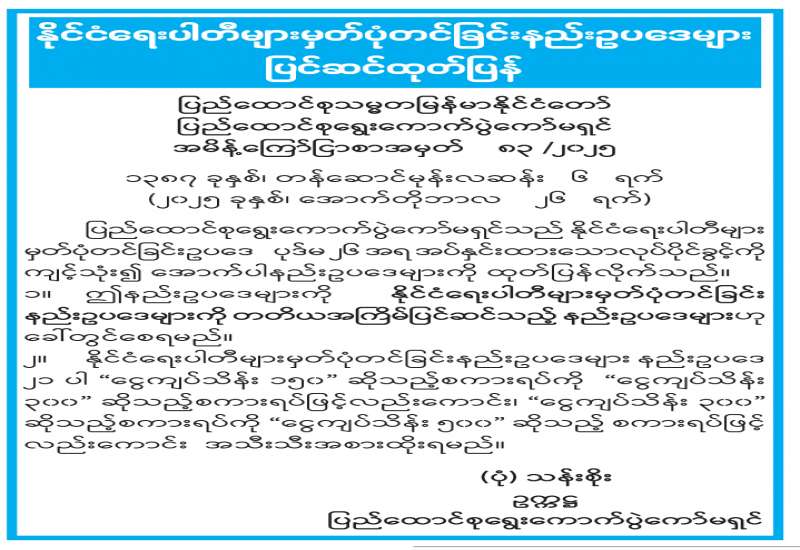 အမျိုးသားလွှတ်တော်ရွေးကောက်ပွဲနည်းဥပဒေများ ပြင်ဆင်ထုတ်ပြန်