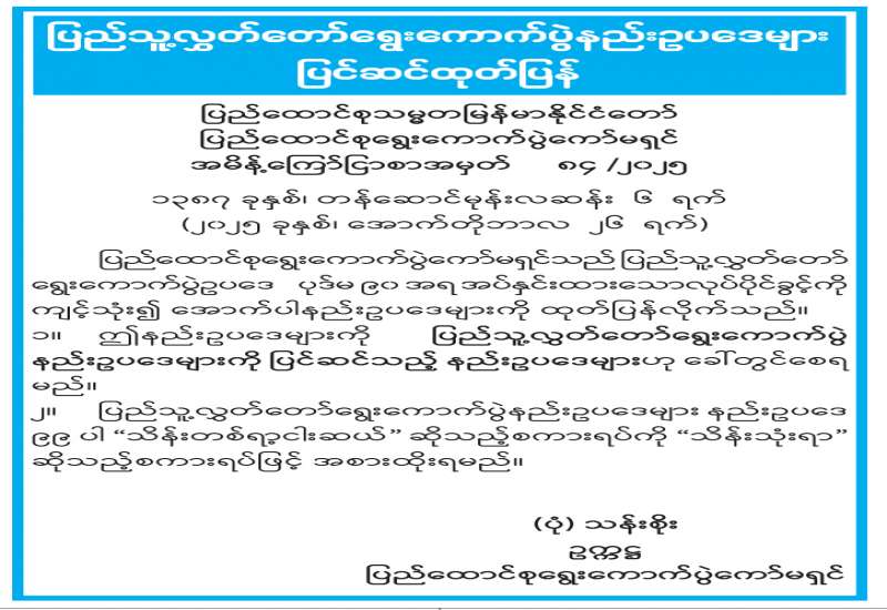 တိုင်းဒေသကြီးလွှတ်တော် သို့မဟုတ် ပြည်နယ်လွှတ်တော်ရွေးကောက်ပွဲနည်းဥပဒေများ ပြင်ဆင်ထုတ်ပြန်