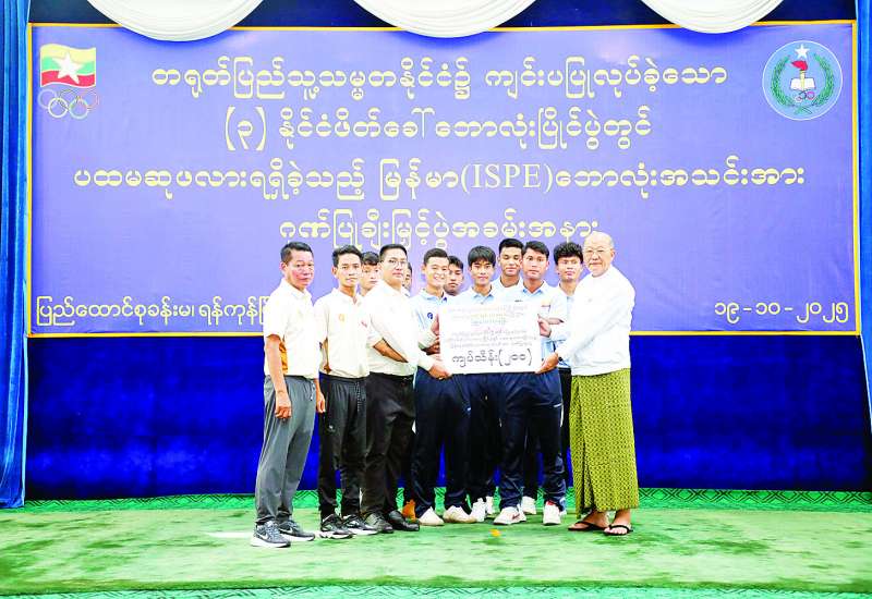 သုံးနိုင်ငံဖိတ်ခေါ်ဖလား အမျိုးသားဘောလုံးပြိုင်ပွဲတွင် ပထမဆုဖလားရရှိခဲ့သည့် အားကစားနှင့်လူငယ်ရေးရာဝန်ကြီးဌာန၊ အားကစားနှင့်ကာယပညာသိပ္ပံ မြန်မာ ISPE အမျိုးသားဘောလုံးအသင်းအား ဂုဏ်ပြုချီးမြှင့်ခြင်းအခမ်းအနားကို ယမန်နေ့ နံနက်ပိုင်းတွင် ရန်ကုန်တိုင်းဒေသကြီး တာမွေမြို့နယ် အားကစားနှင့်ကာယပညာသိပ္ပံ(ရန်ကုန်)ရှိ ပြည်ထောင်စုခန်းမ၌ ကျင်းပသည်။