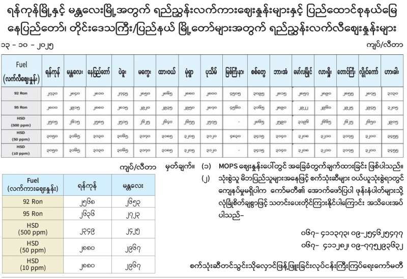 ရန်ကုန်မြို့နှင့် မန္တလေးမြို့အတွက် ရည်ညွှန်းလက်ကားဈေးနှုန်းများနှင့် ပြည်ထောင်စုနယ်မြေ နေပြည်တော်၊ တိုင်းဒေသကြီး/ပြည်နယ် မြို့တော်များအတွက် ရည်ညွှန်းလက်လီဈေးနှုန်းများ